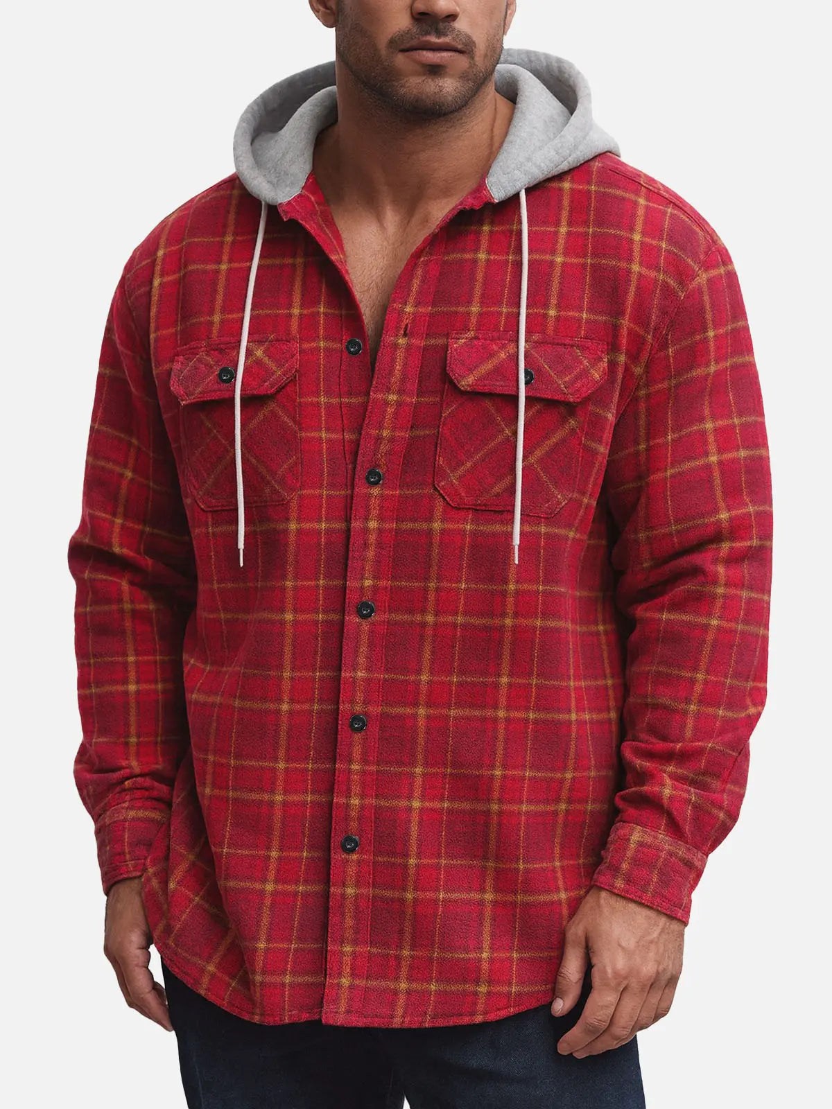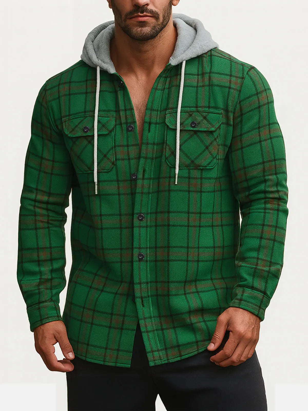 Men's Hooded Plaid Flannel Long Sleeve Shirt Jacket