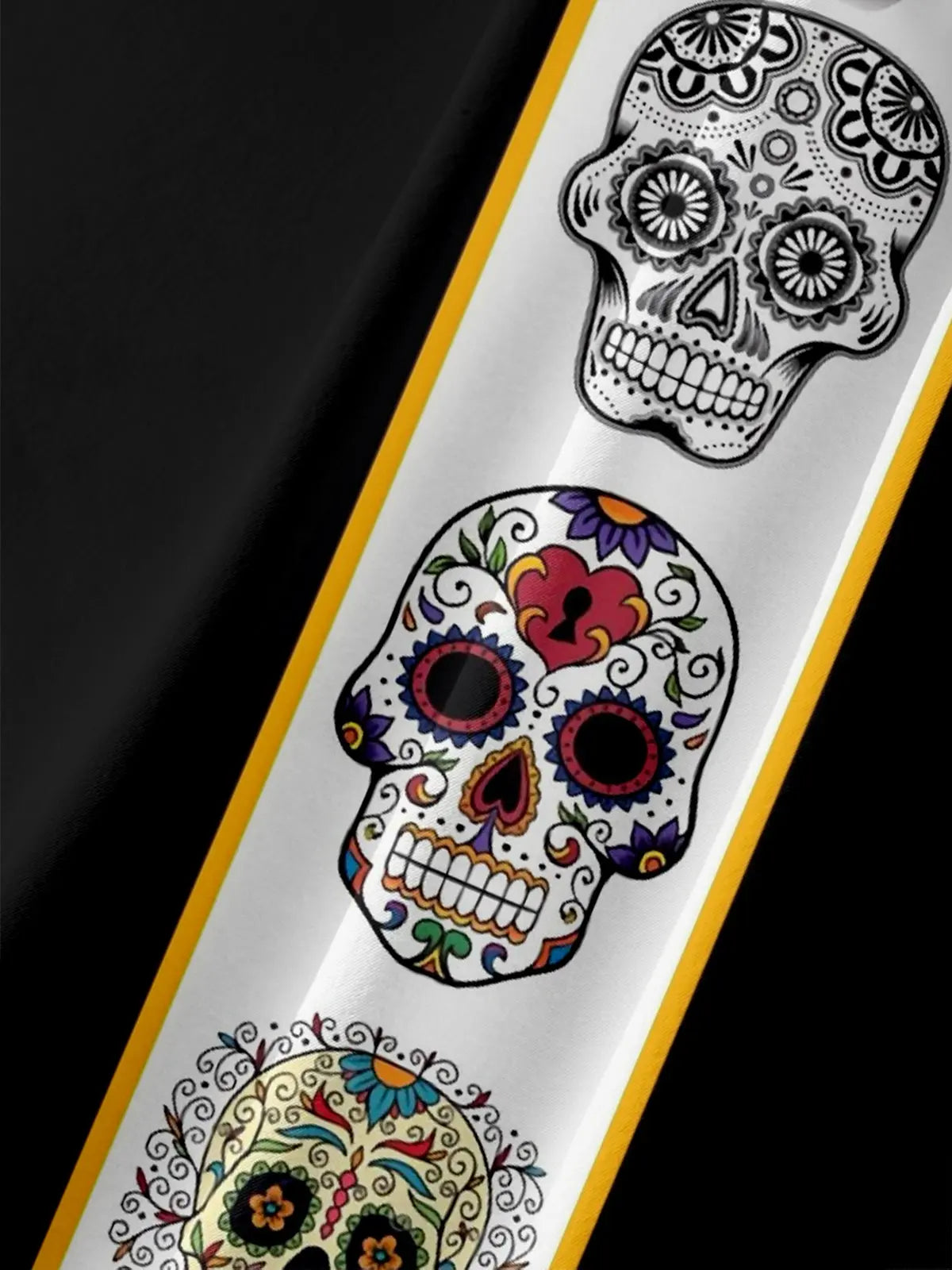 Celebrate life's vibrancy with our Sugar Skulls bowling shirt featuring colorful Día de los Muertos calavera designs against sleek black. This bold vertical panel showcases intricately decorated skulls in various styles—perfect for those who appreciate Mexican folk art with contemporary edge.