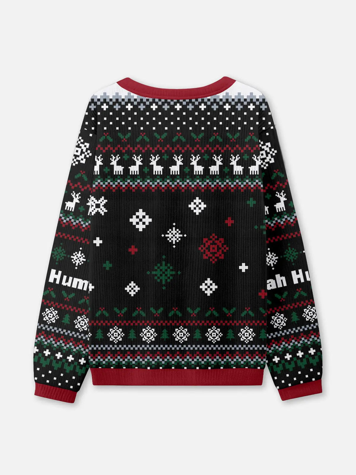 Tech humor meets holiday tradition with this novelty sweater featuring a pixelated “404 Christmas Spirit Not Found” design alongside a grumpy Scrooge motif. With festive snowflakes, reindeer, and pixel art borders, it’s the ultimate geek-chic twist on ugly Christmas sweaters.