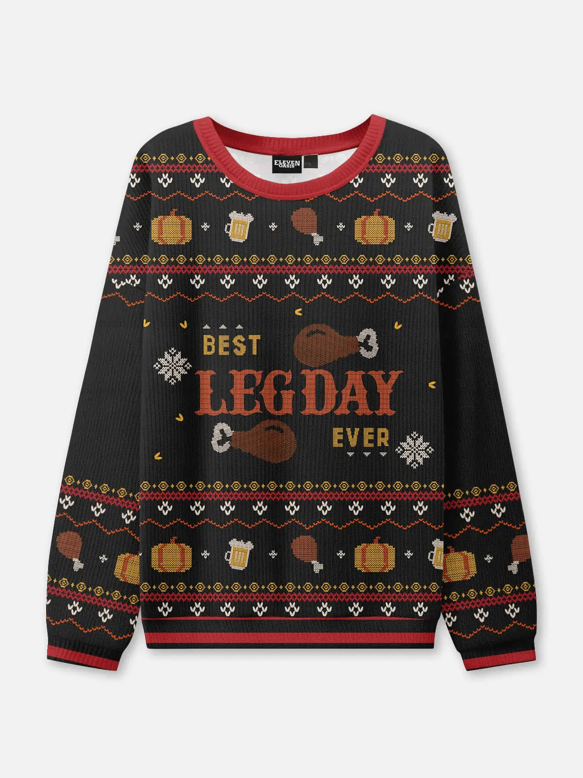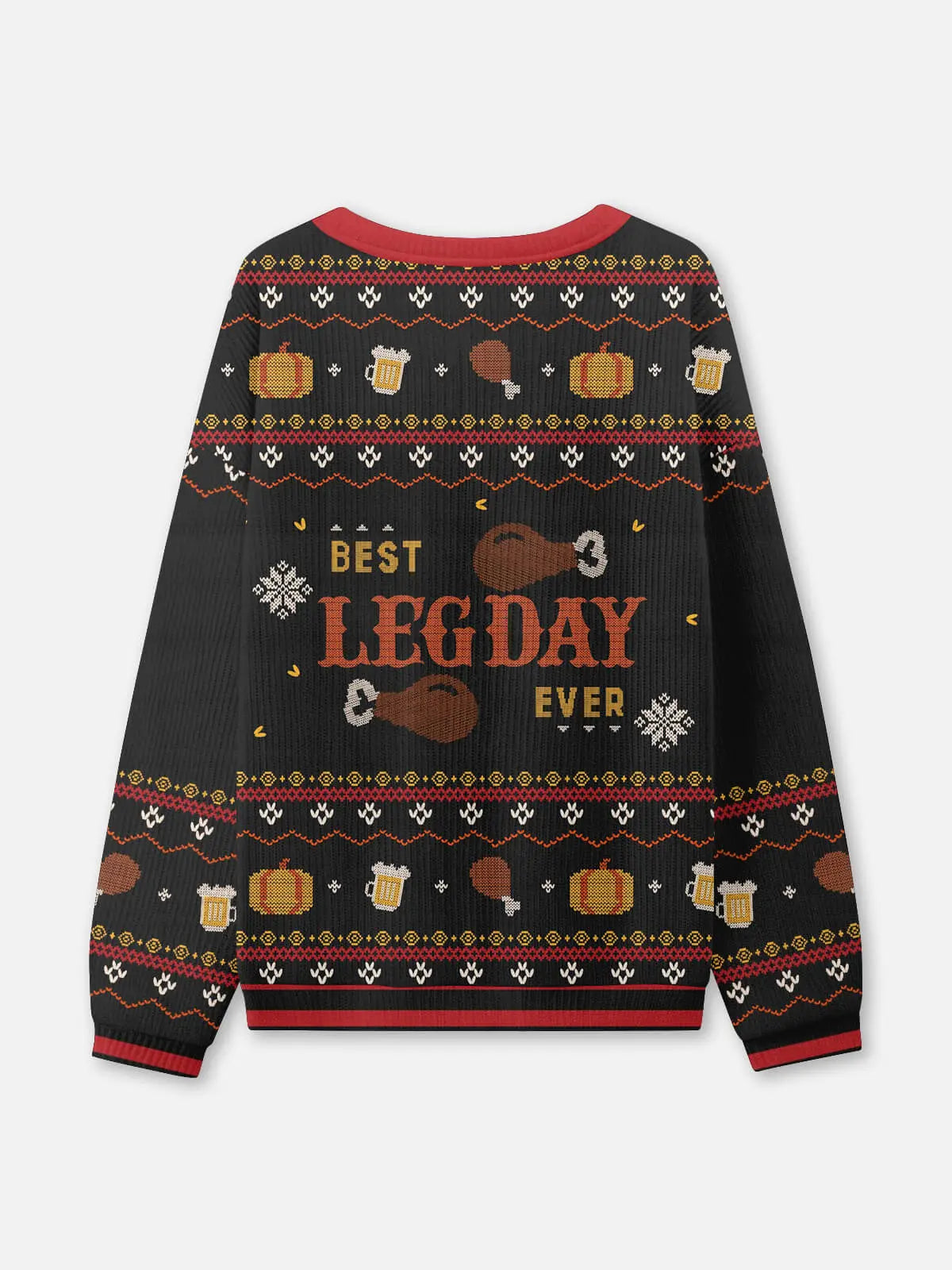 Celebrate Turkey Day with humor in this “Best Leg Day Ever” ugly sweater, featuring drumsticks, beer mugs, pumpkins, and festive knit patterns. Perfect for bringing laughs to the holiday table or winning an ugly sweater contest, it combines playful design with cozy seasonal comfort.