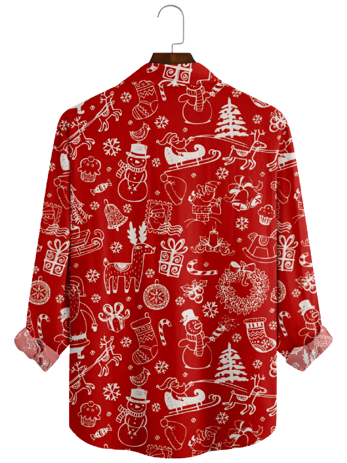 Embrace the festive spirit with this whimsical Christmas-themed shirt, adorned with a charming mix of snowmen, reindeer, gifts, and holiday cheer. The vibrant red design captures the magic of the season, making it a perfect choice for spreading joy at any Christmas gathering.