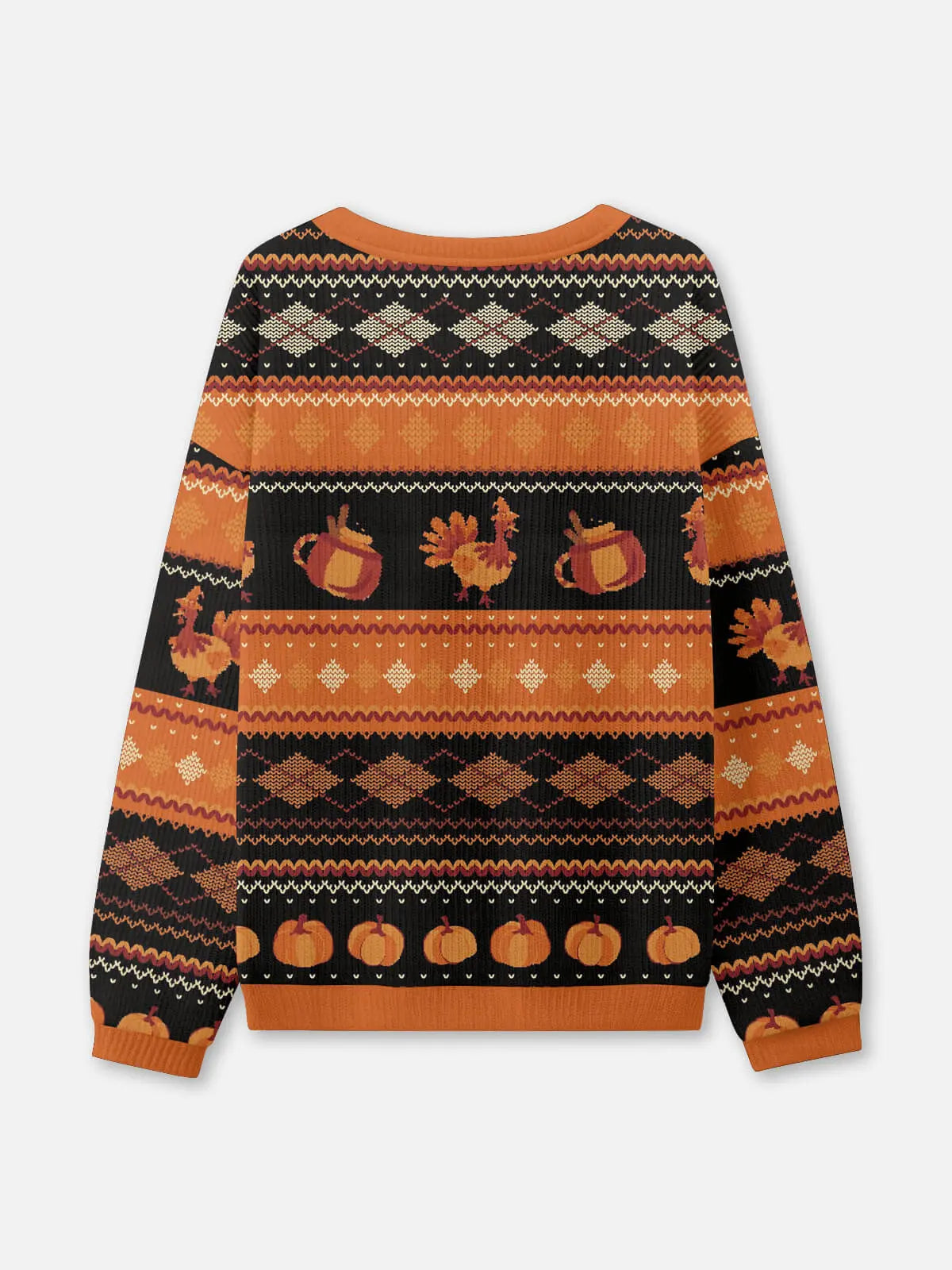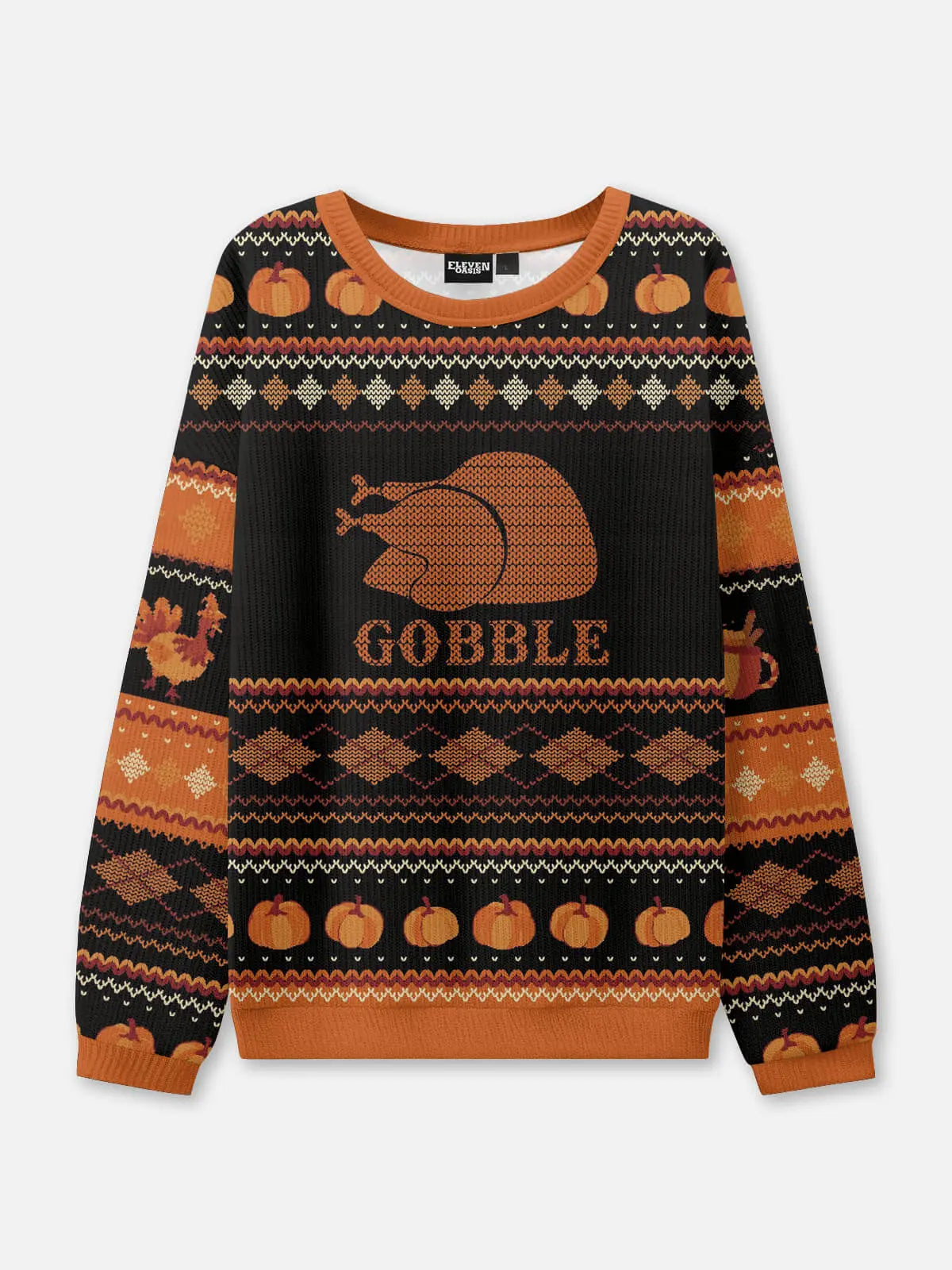 This festive sweater features a roasted turkey graphic with the word “Gobble,” surrounded by pumpkins, turkeys, and holiday knit patterns. With its playful design and cozy knit construction, it’s perfect for adding humor and holiday cheer to Thanksgiving gatherings and seasonal celebrations.