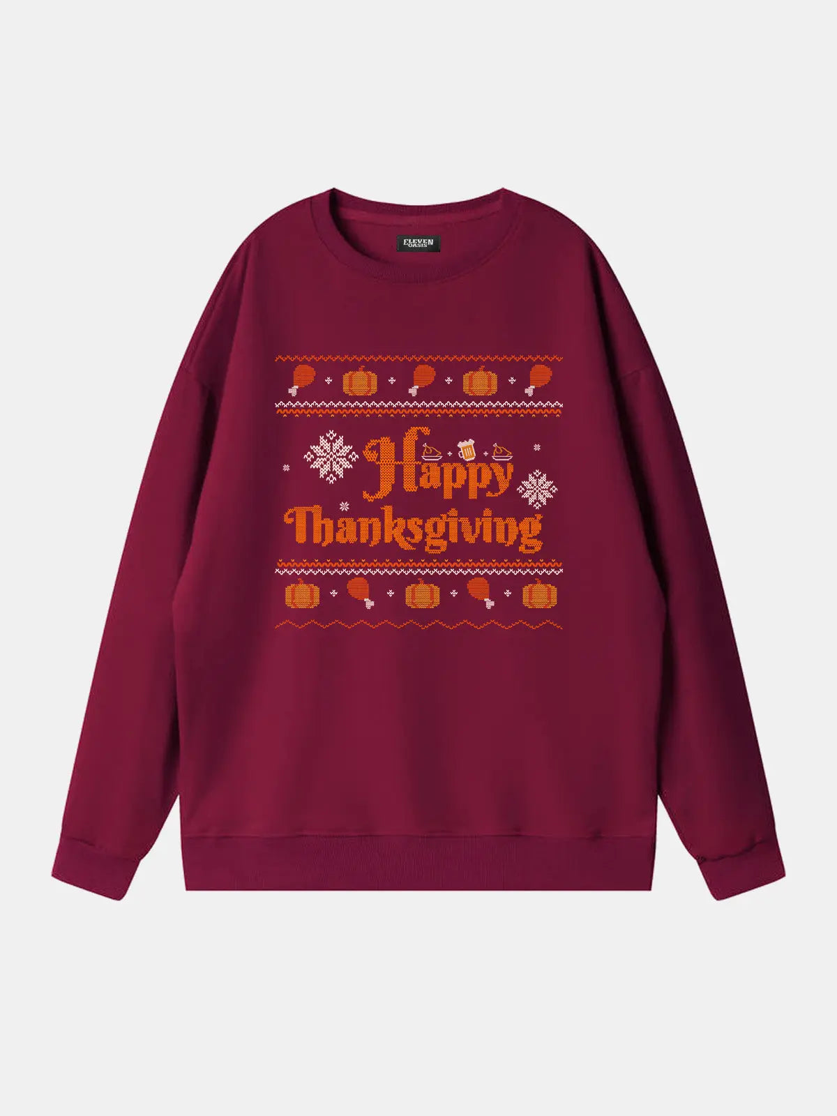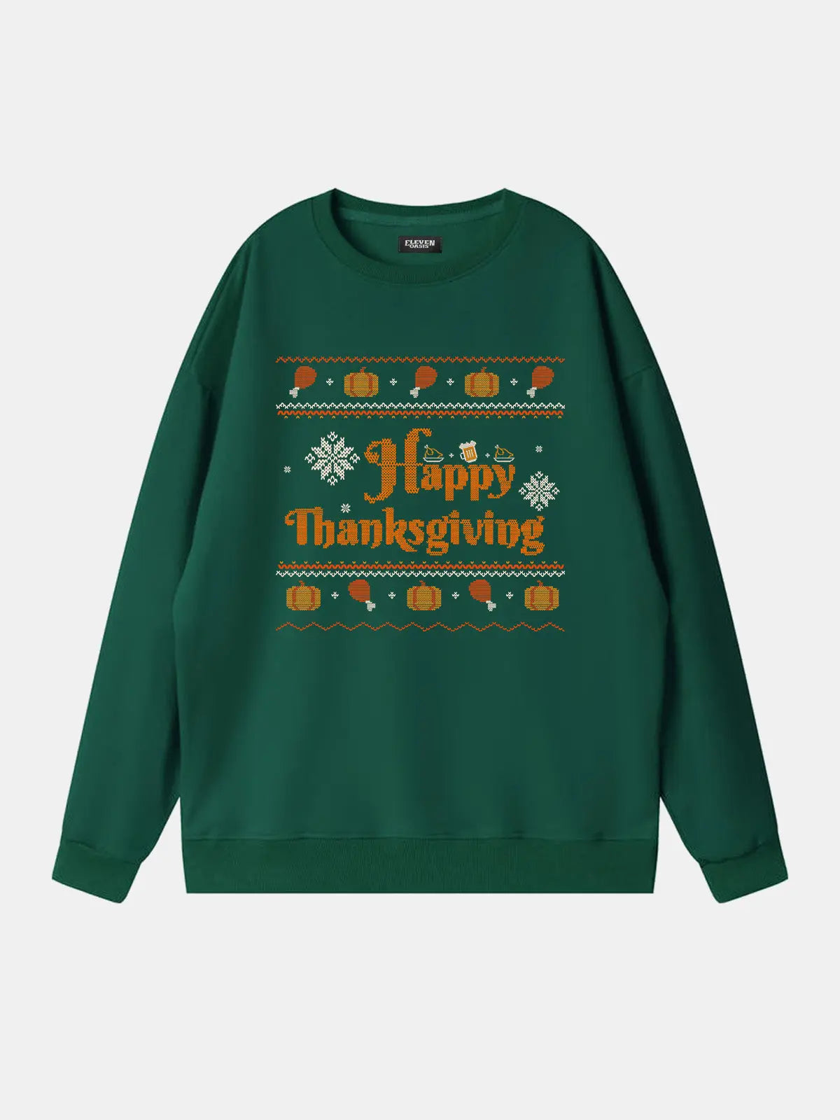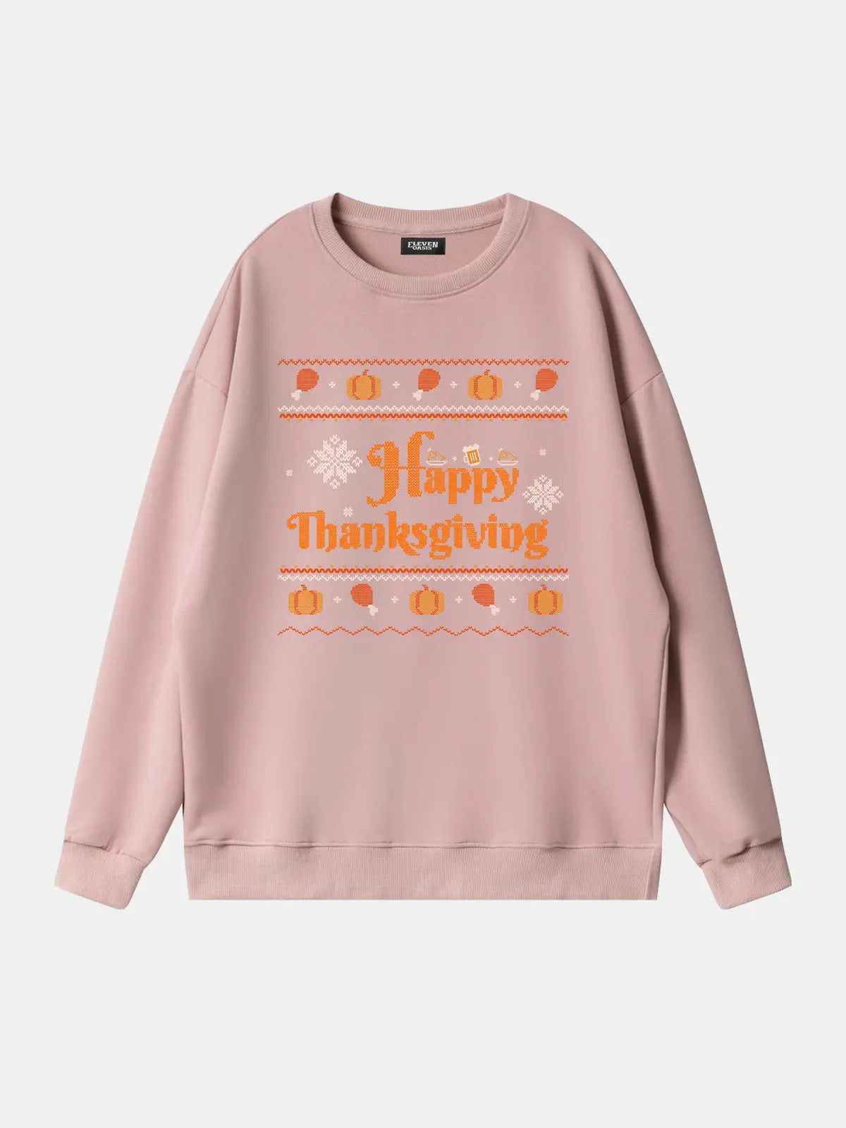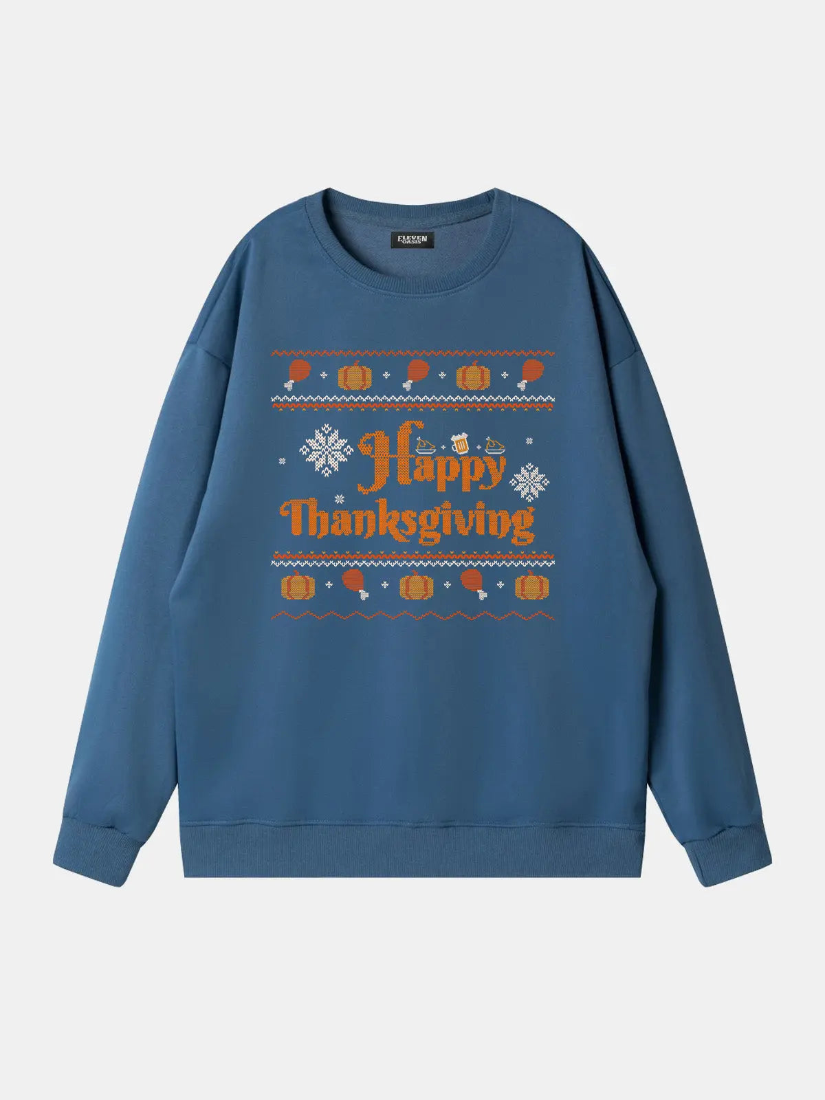 This festive sweatshirt features a bold “Happy Thanksgiving” message surrounded by pumpkins, turkey legs, and playful knit-style accents. Perfect for adding humor and holiday cheer, it’s designed for cozy comfort at seasonal gatherings, Friendsgiving parties, or casual fall celebrations.