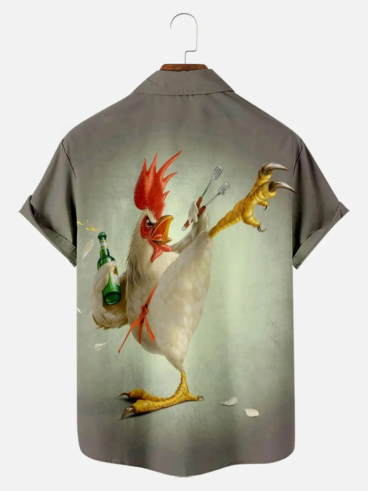 Humorous men's novelty shirt featuring a martial arts rooster character with beer and barbecue tools. This conversation-starting design brings a playful attitude with its detailed illustration and quirky concept. Perfect for backyard cookouts, casual gatherings, and anyone who appreciates offbeat humor with their summer style.