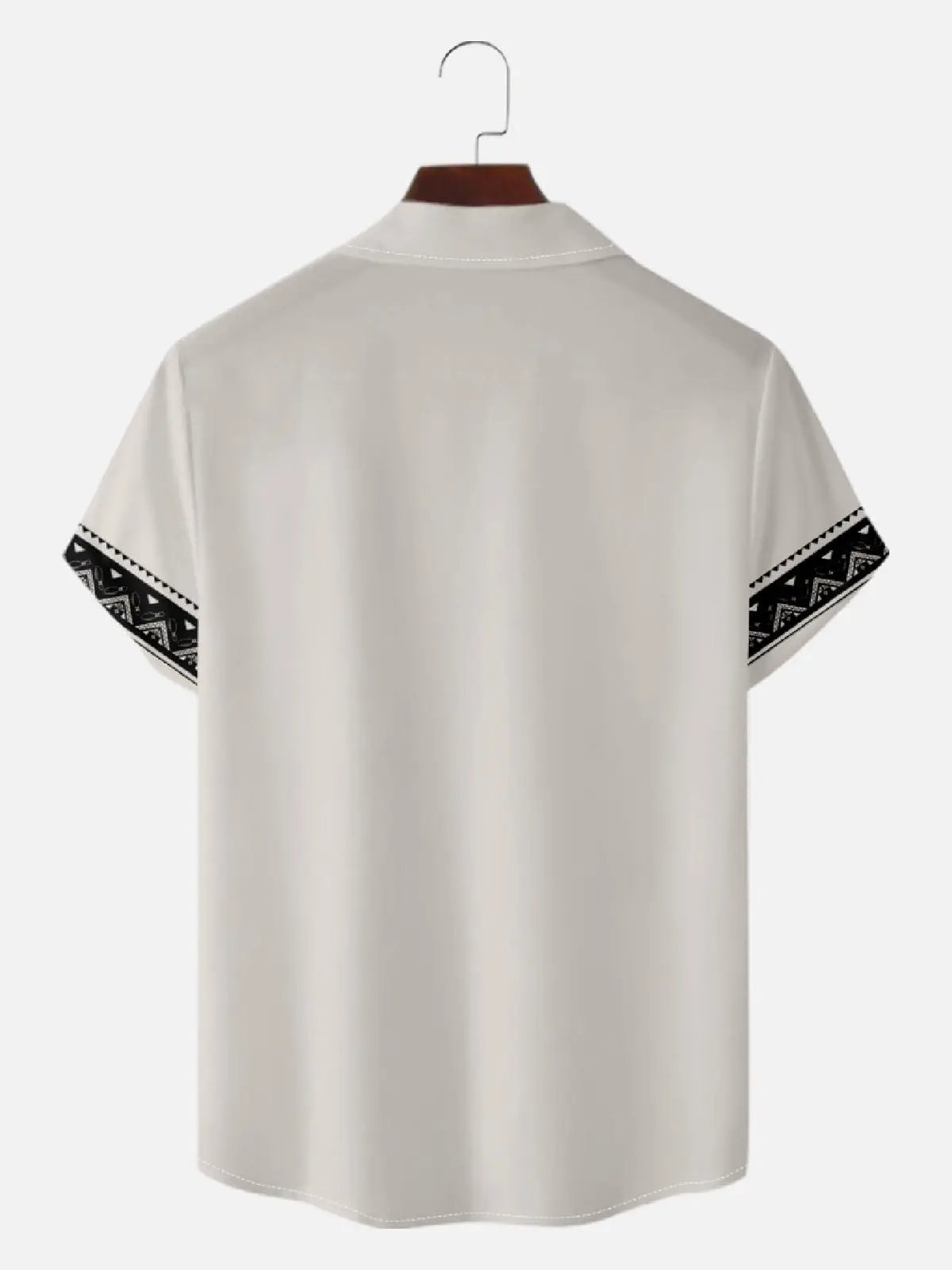 Classic design featuring intricate geometric border patterns and traditional trim detailing that creates a sophisticated folk-inspired aesthetic. This refined shirt combines clean, solid construction with decorative geometric elements along the front panel and sleeves, perfect for those who appreciate traditional craftsmanship and want to showcase their appreciation for cultural design heritage with authentic border styling.