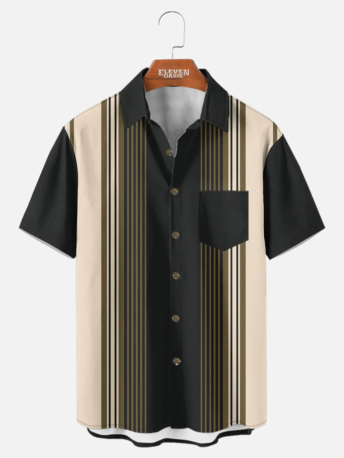 A crisp stripe pattern runs vertically across the body, blending retro bowling charm with a polished finish. Designed with a relaxed fit and button closure, it’s an easy go-to for both casual days and standout nights.