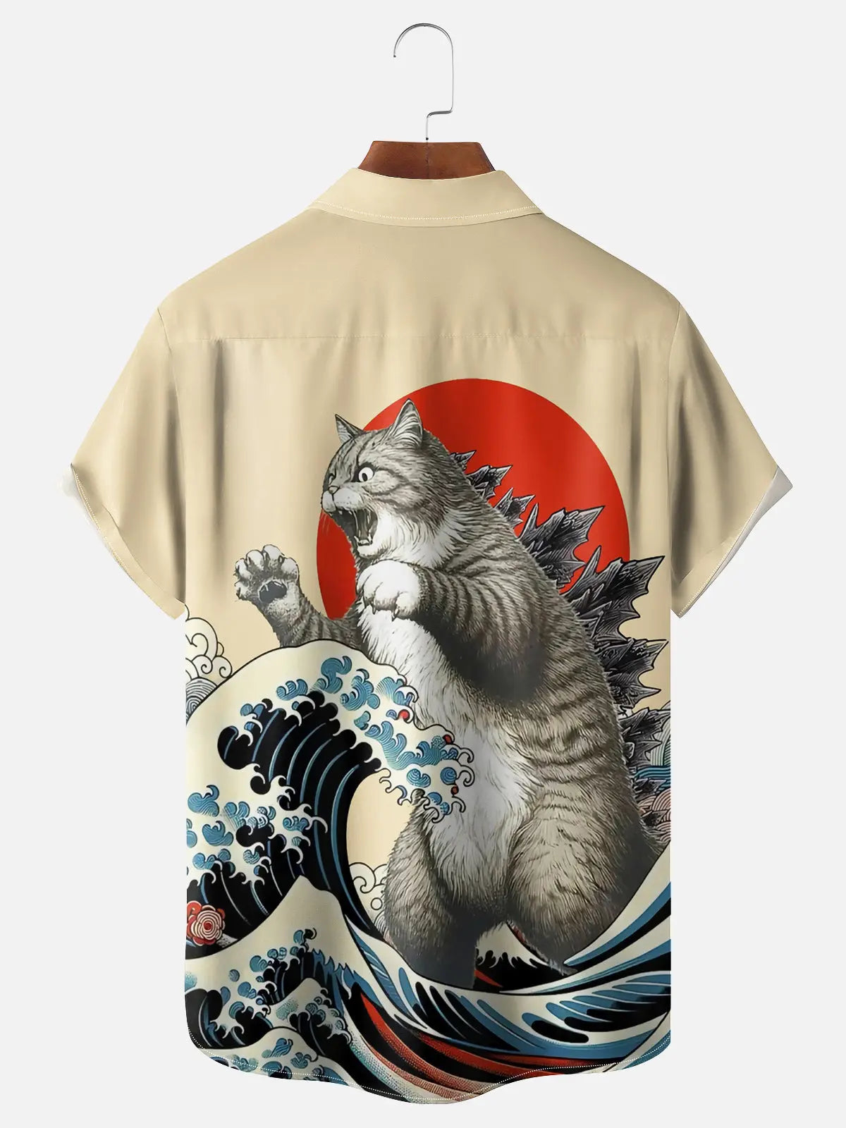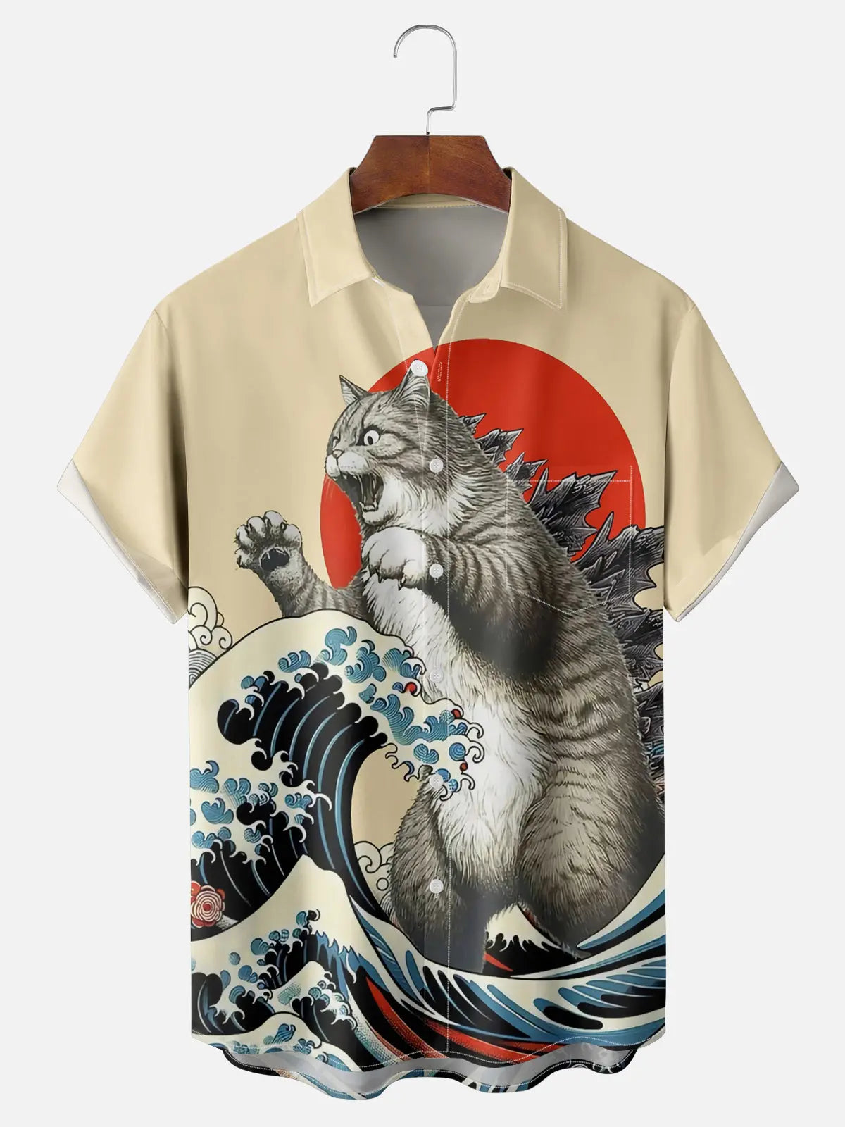 Embrace quirky humor with our "Catzilla" shirt featuring a giant feline monster against Hokusai-inspired waves and rising sun. This playful design merges classic Japanese art with pop culture monster movies, transforming an ordinary housecat into a fearsome kaiju for cat lovers with an appreciation for cinematic and artistic mashups.