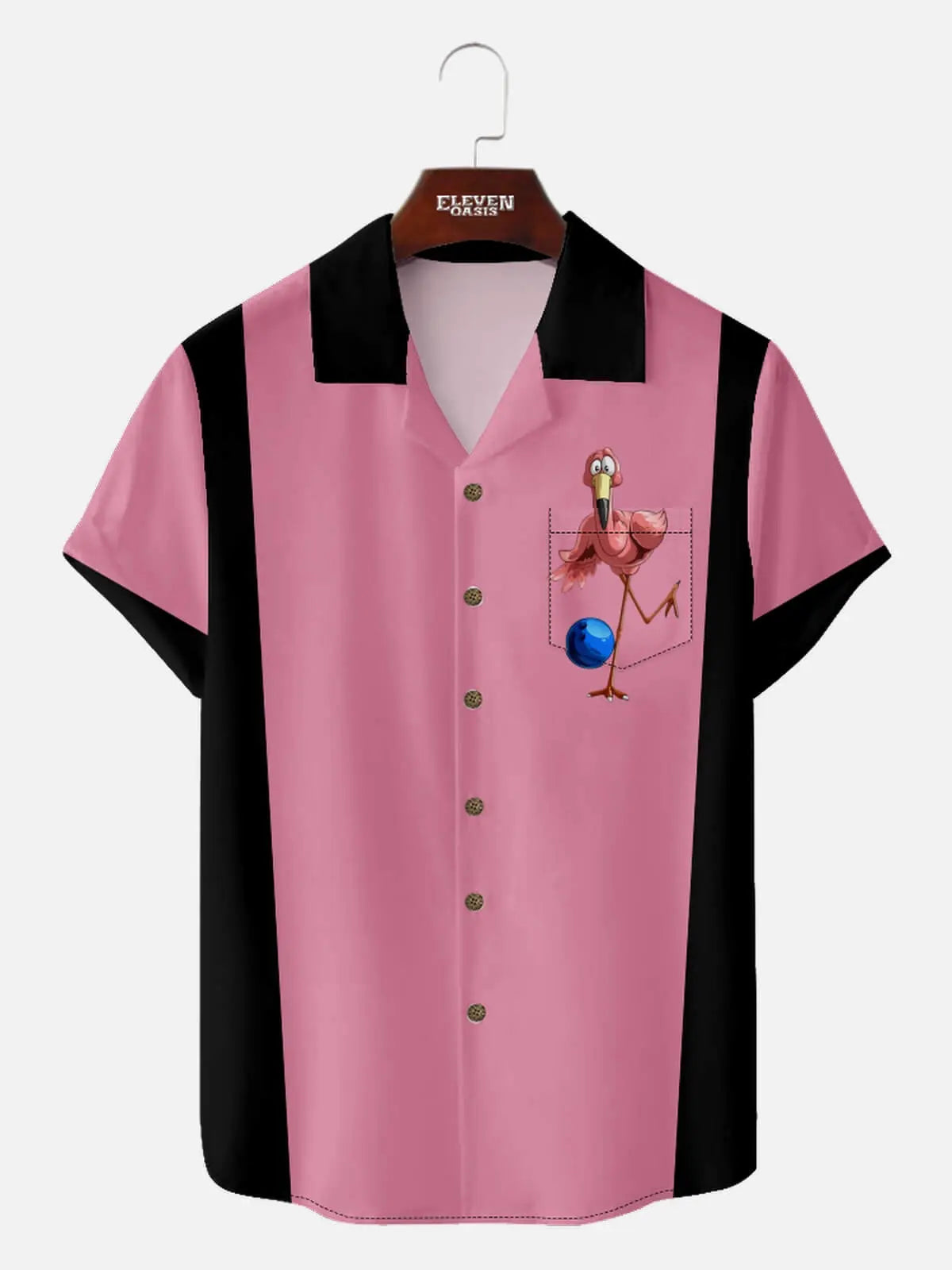 When the lanes get tropical. This retro bowling shirt features clean vertical paneling and a cartoon flamingo ready to strike from your chest pocket. Perfect for laid-back league nights or just rolling through the weekend in style.