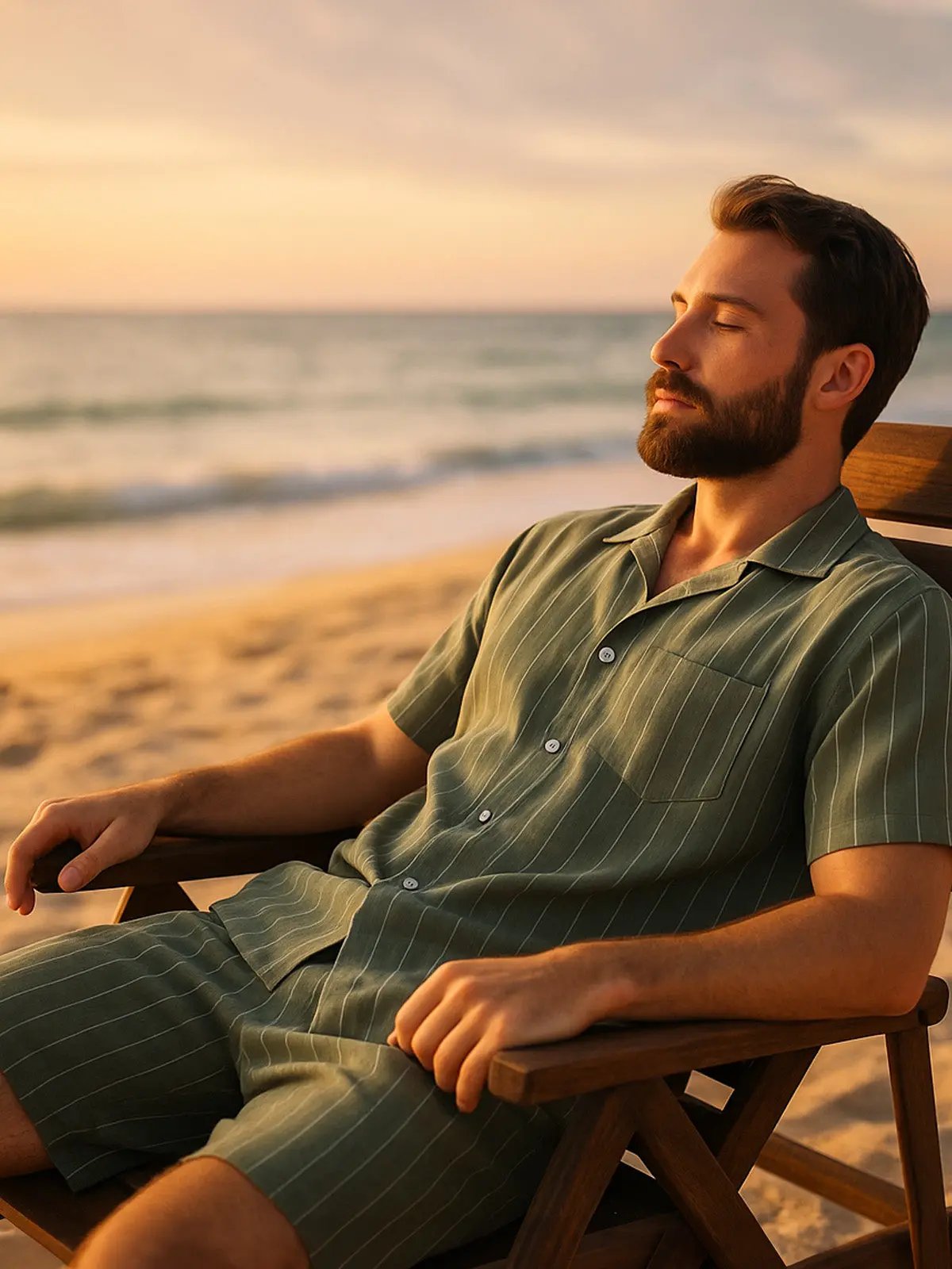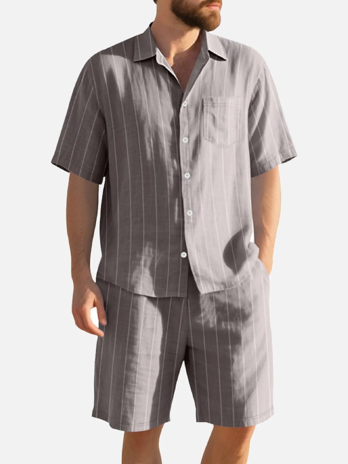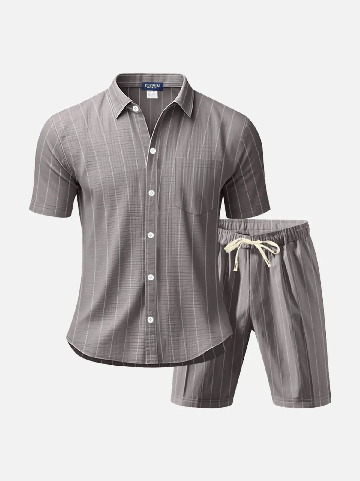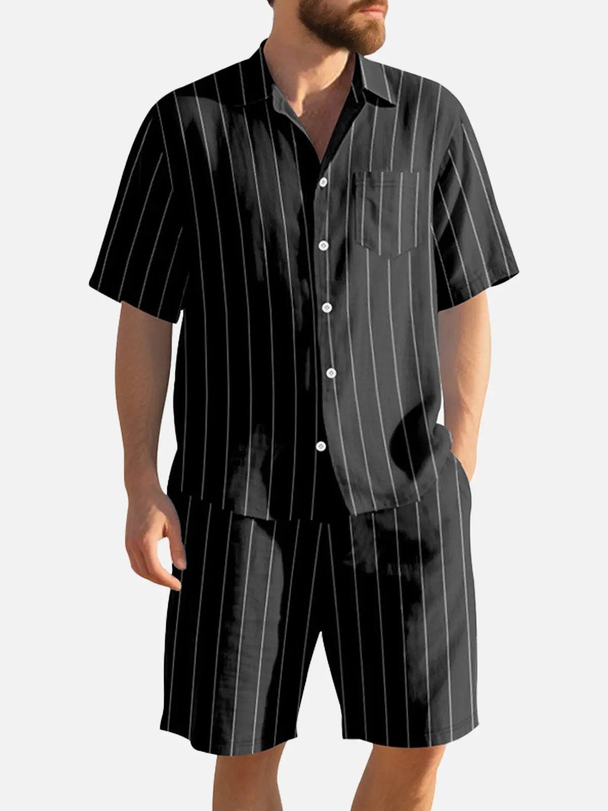 Sophisticated summer coordination featuring vertical pinstripe detailing on both short sleeve shirt and matching shorts in premium linen blend fabric. This refined matching set combines classic tailoring with relaxed summer comfort for effortless warm-weather elegance. Perfect for resort destinations and those who appreciate coordinated summer sophistication.