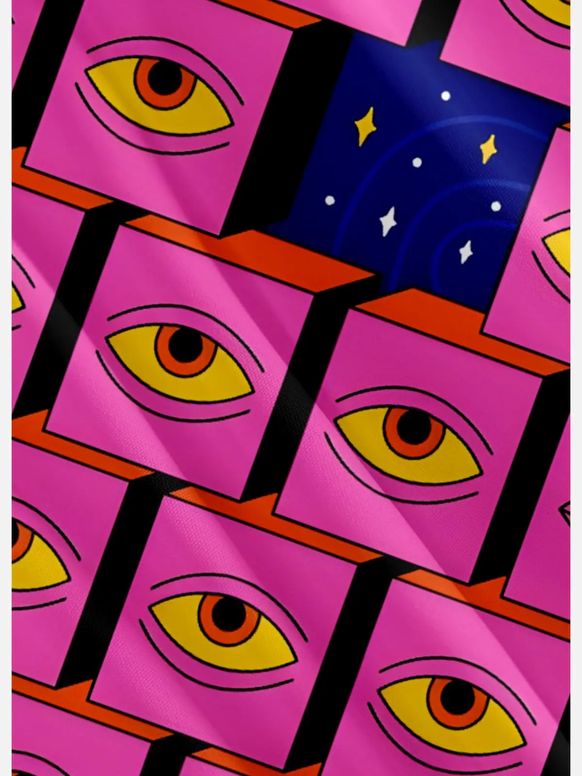 Bold psychedelic design featuring hypnotic eye motifs and cosmic elements that capture the essence of 1970s counterculture and trippy visual art. This striking shirt combines repetitive eye patterns with vibrant colors and starry cosmic sections, perfect for those who appreciate retro psychedelic aesthetics and want to showcase their appreciation for groovy 70s art and mind-bending visual design.
