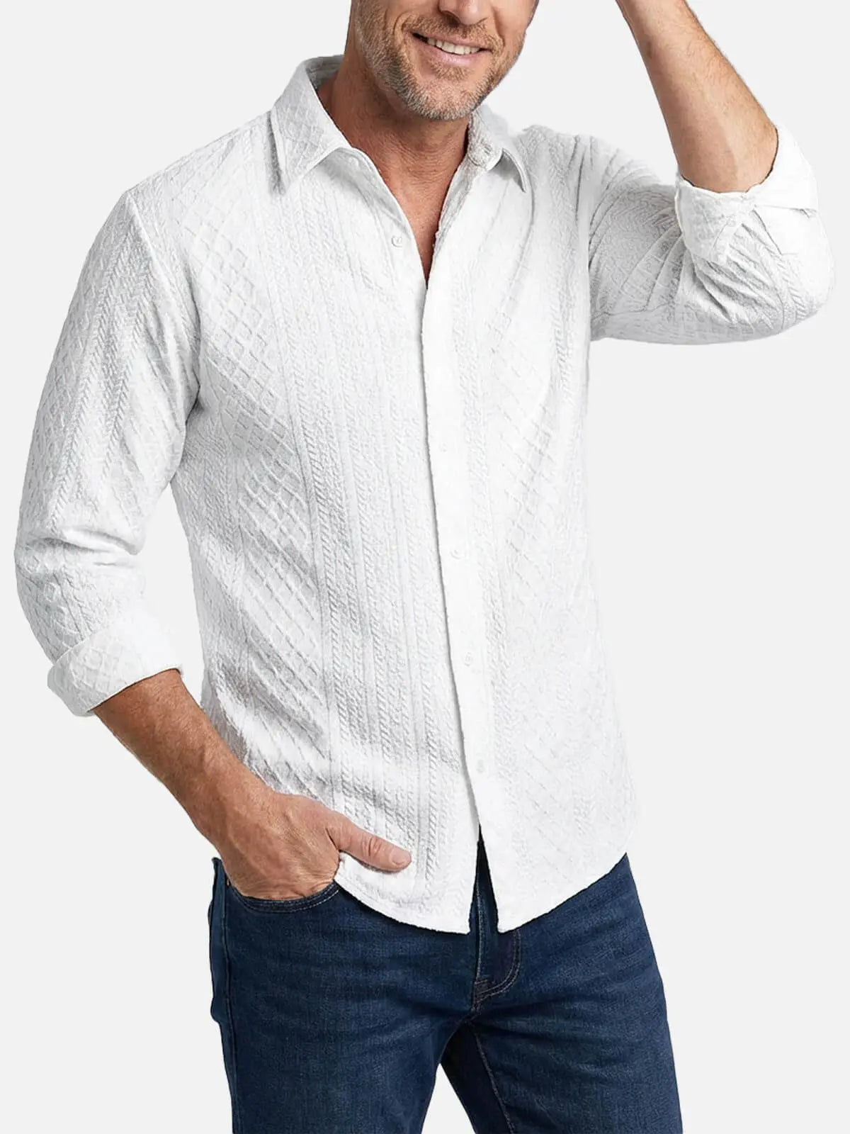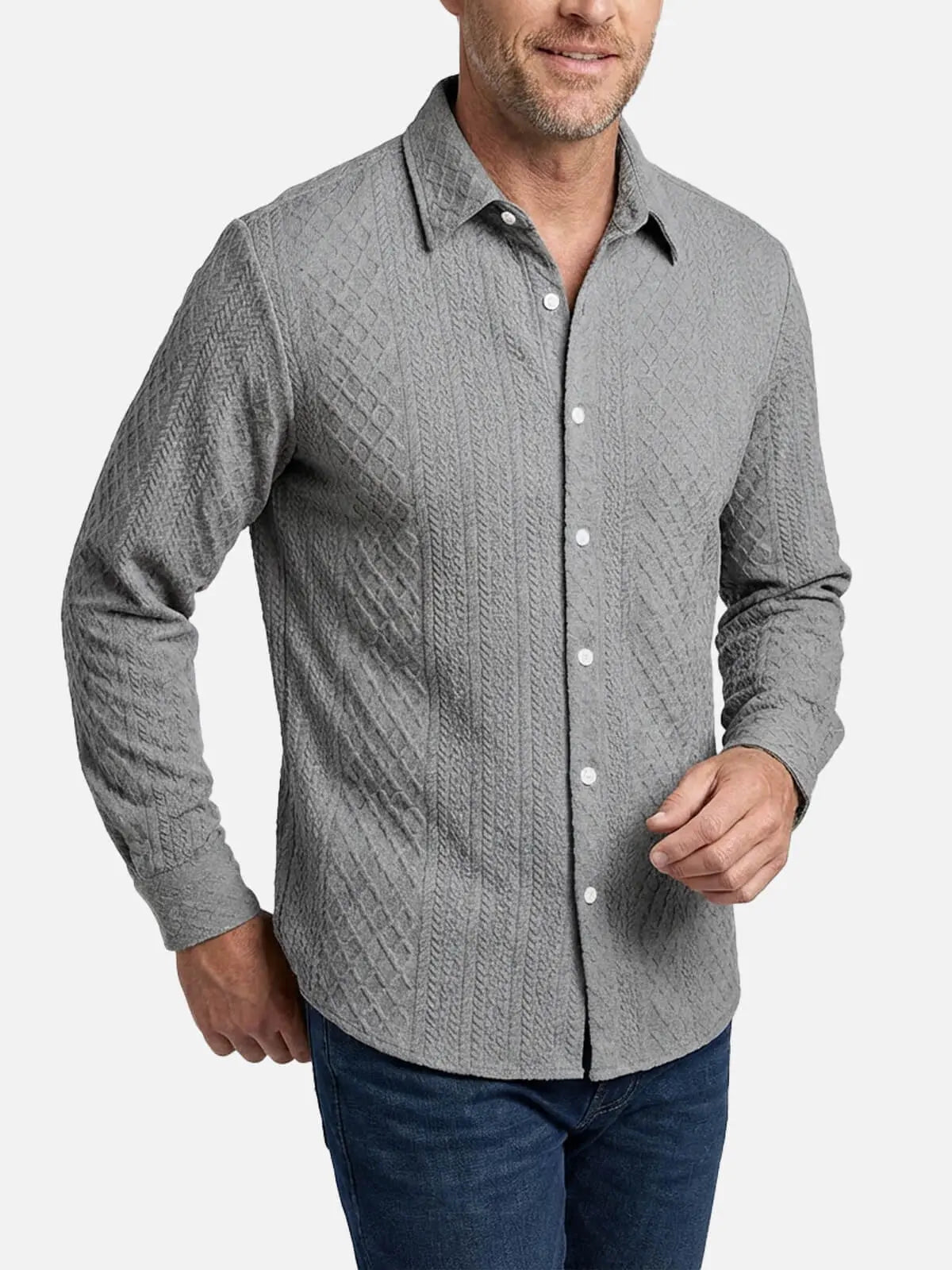 Crafted with a unique cable-knit pattern, this slim-fit shirt brings a sharp, sophisticated look to any occasion. The textured fabric adds depth and interest, while the tailored cut ensures a flattering fit for a modern, confident appearance.