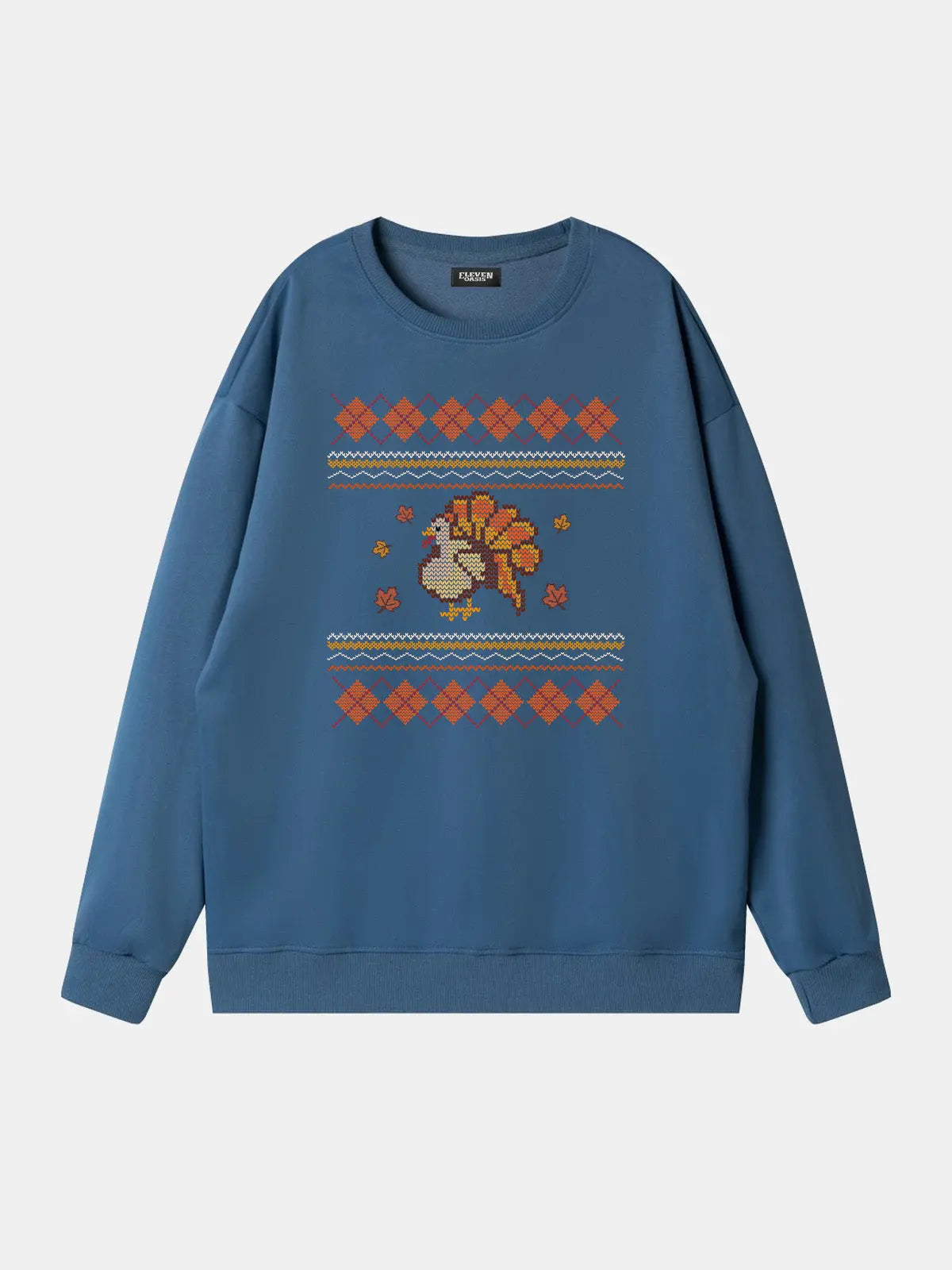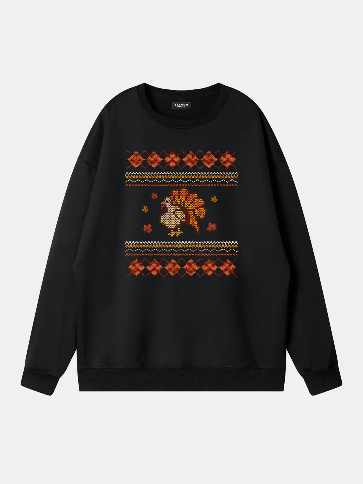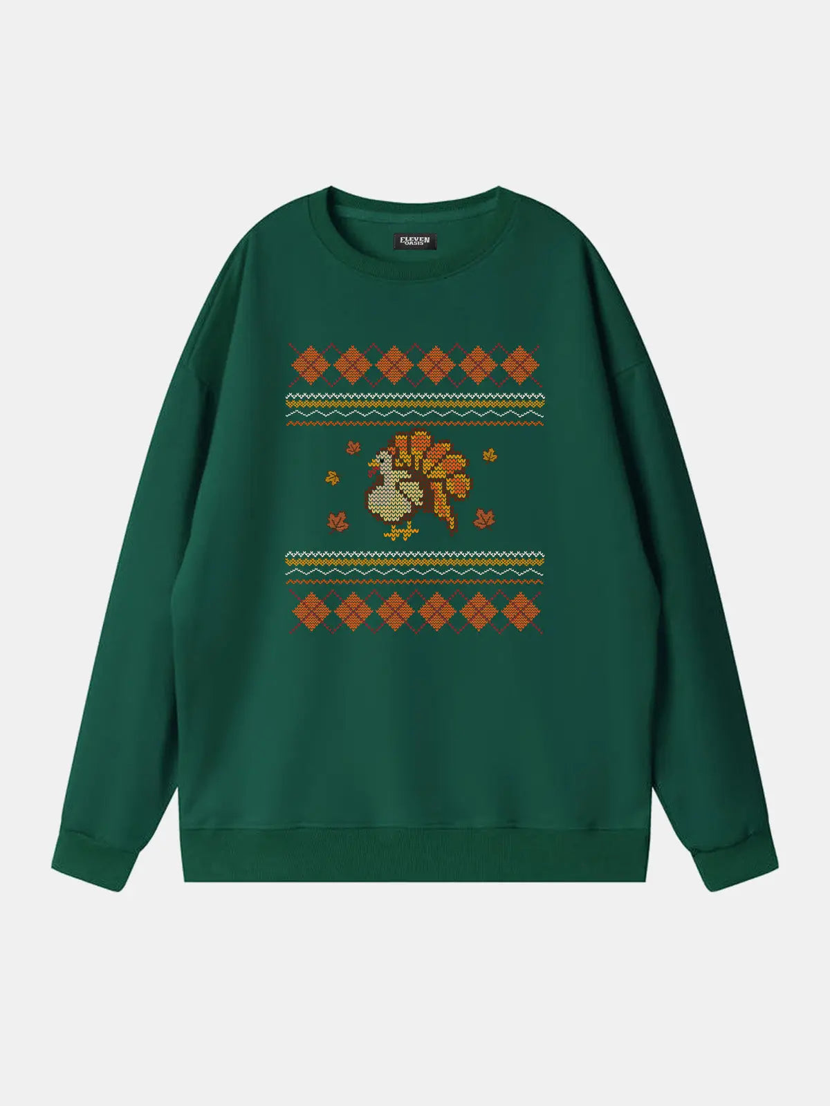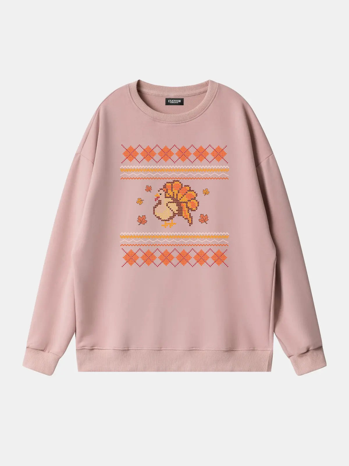 This festive sweatshirt features a bold turkey design framed by autumn leaves and diamond-knit accents. Perfect for celebrating the holiday season with cozy comfort and playful style, it’s a fun choice for Thanksgiving gatherings, Friendsgiving parties, and seasonal photos.