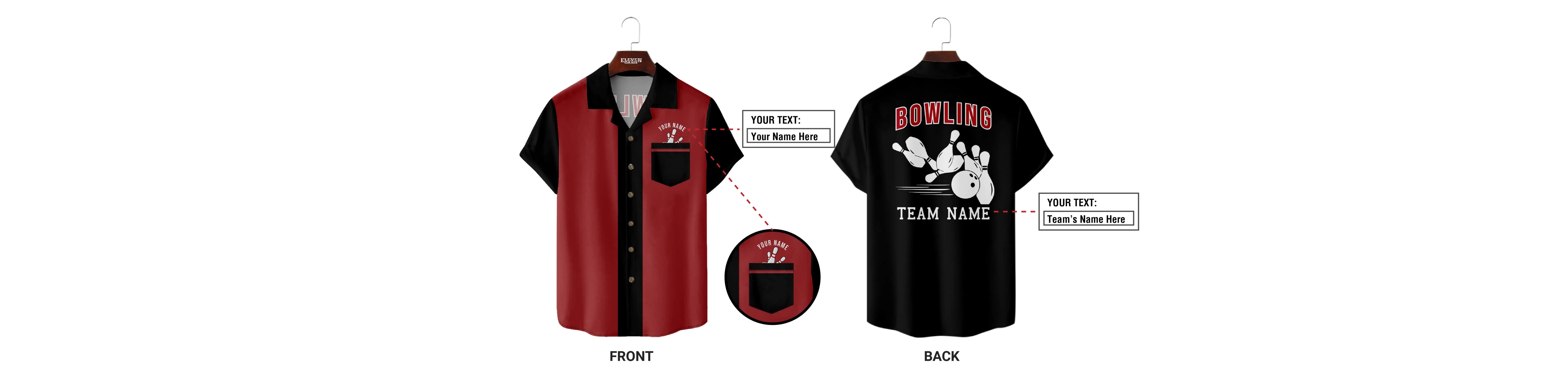 For bowling shirts, your individual name appears on the chest pocket area, while your team name is displayed prominently on the back.