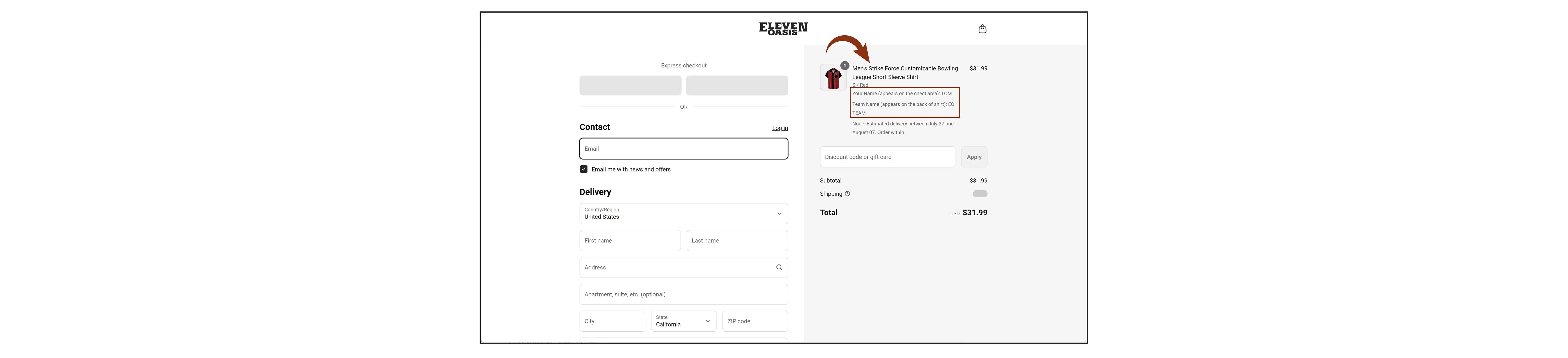 Enter your personal name (front of shirt) and team name (back of shirt) in the dedicated fields on the product page.
