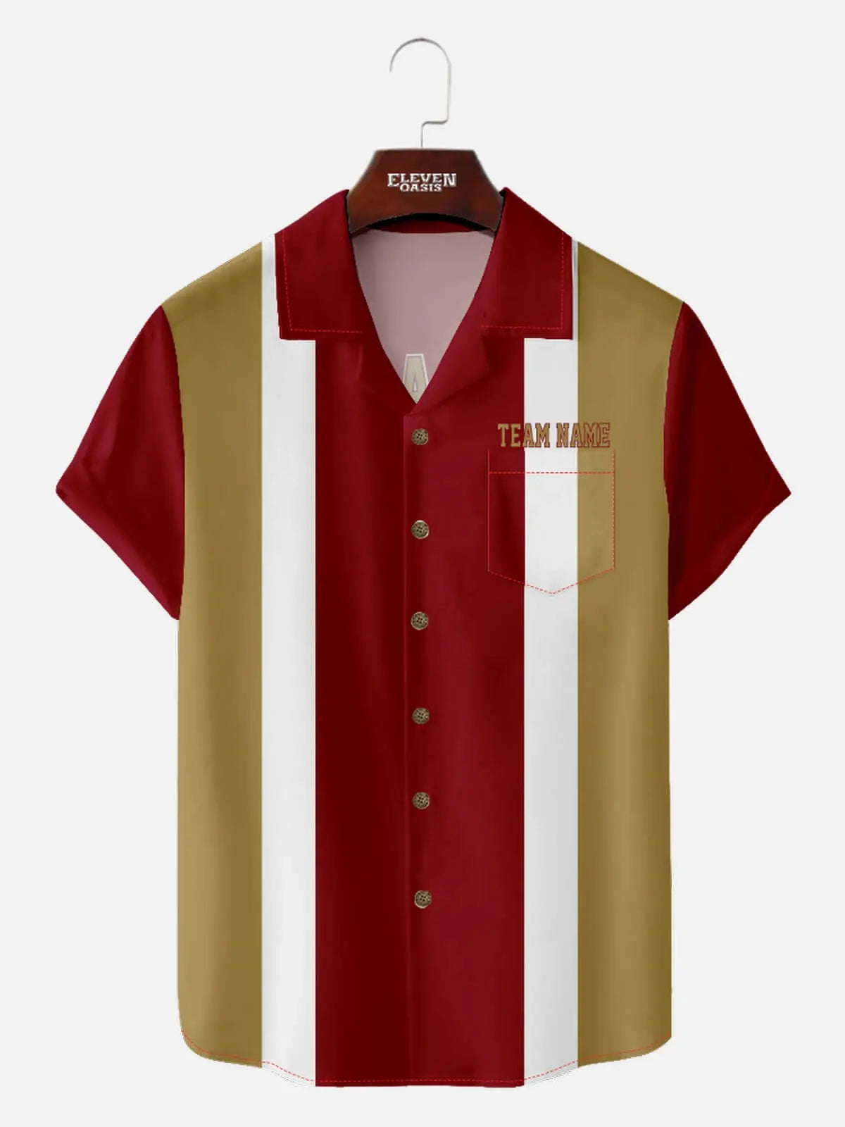 Bring classic football pride into a retro bowling shirt silhouette. Designed with bold vertical striping, contrast panels, and a timeless camp collar, this custom shirt blends old school team style with laid back confidence. Personalize it with your team name to create a one of a kind piece made for game days and beyond.