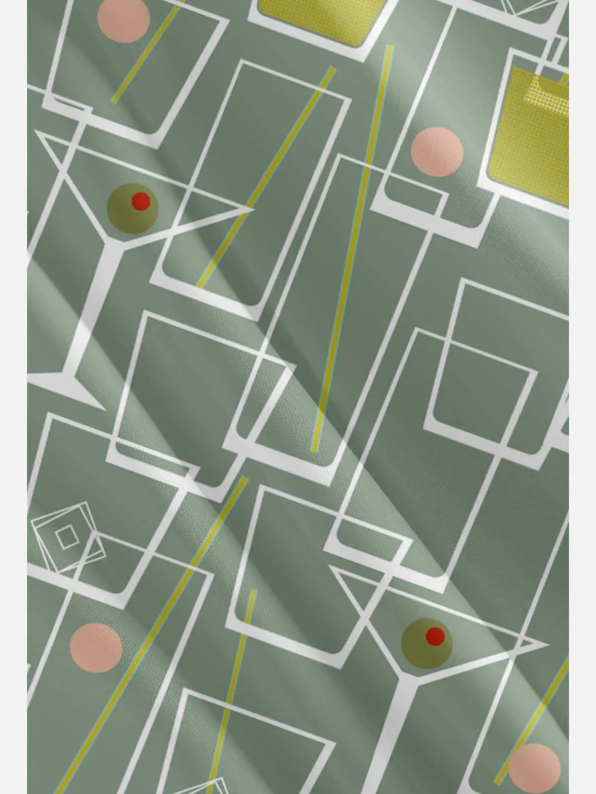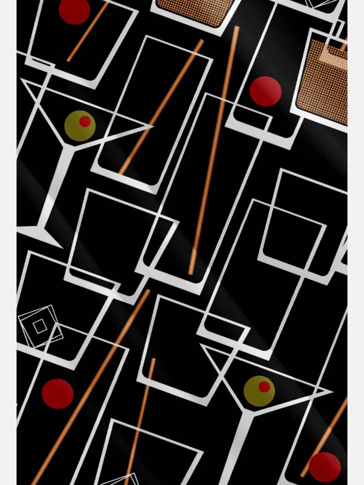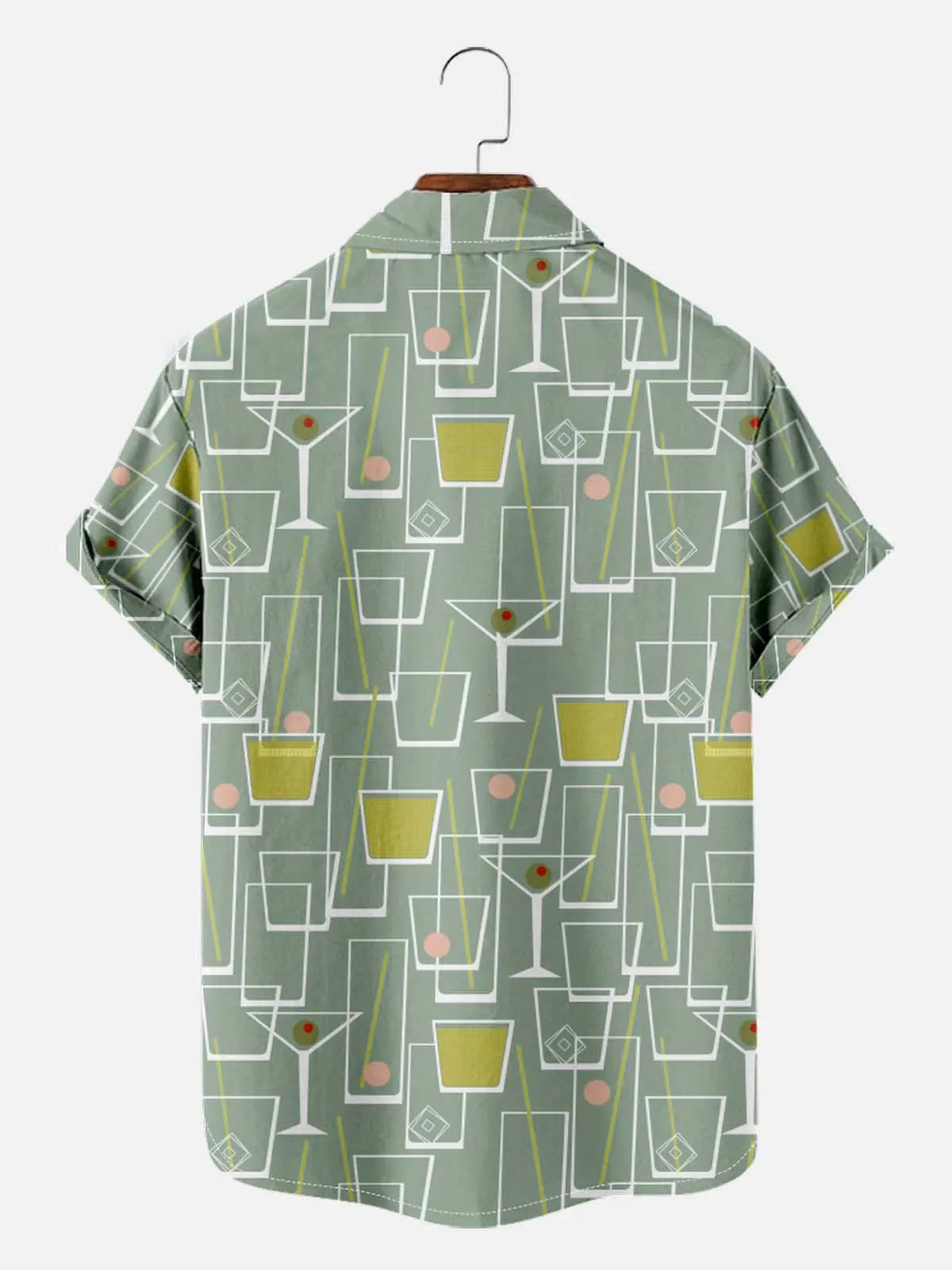 Sophisticated mid-century modern cocktail culture featuring geometric martini glasses, whiskey tumblers, and atomic age design elements in authentic 1950s lounge styling. This retro-inspired shirt captures the golden era of cocktail lounges and sophisticated entertaining with period-correct atomic patterns, perfect for those who appreciate vintage cocktail culture and classic American lounge aesthetics.