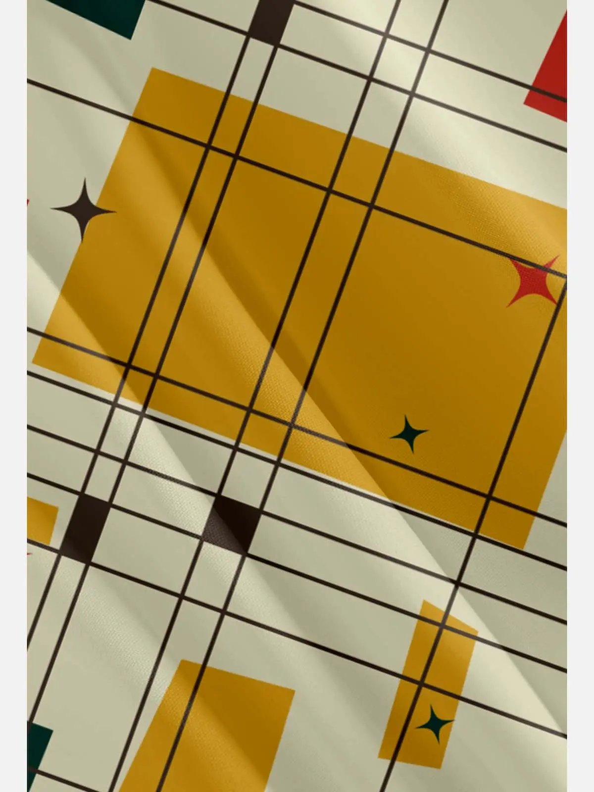 Bold 1950s-inspired design featuring geometric grid patterns, color blocks, and scattered star motifs that capture the essence of mid-century modern design and atomic age aesthetics. This sophisticated shirt combines vintage modernist elements with structured grid lines and playful geometric shapes, perfect for those who appreciate architectural styling and want to showcase their love for mid-century design heritage and atomic era graphics.