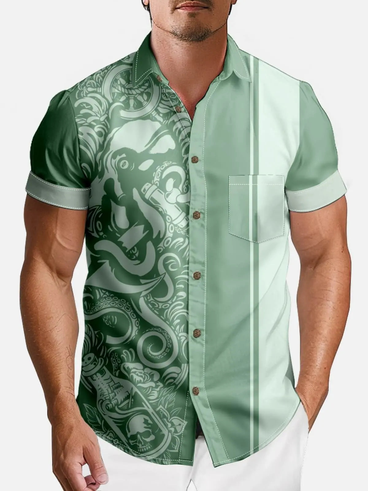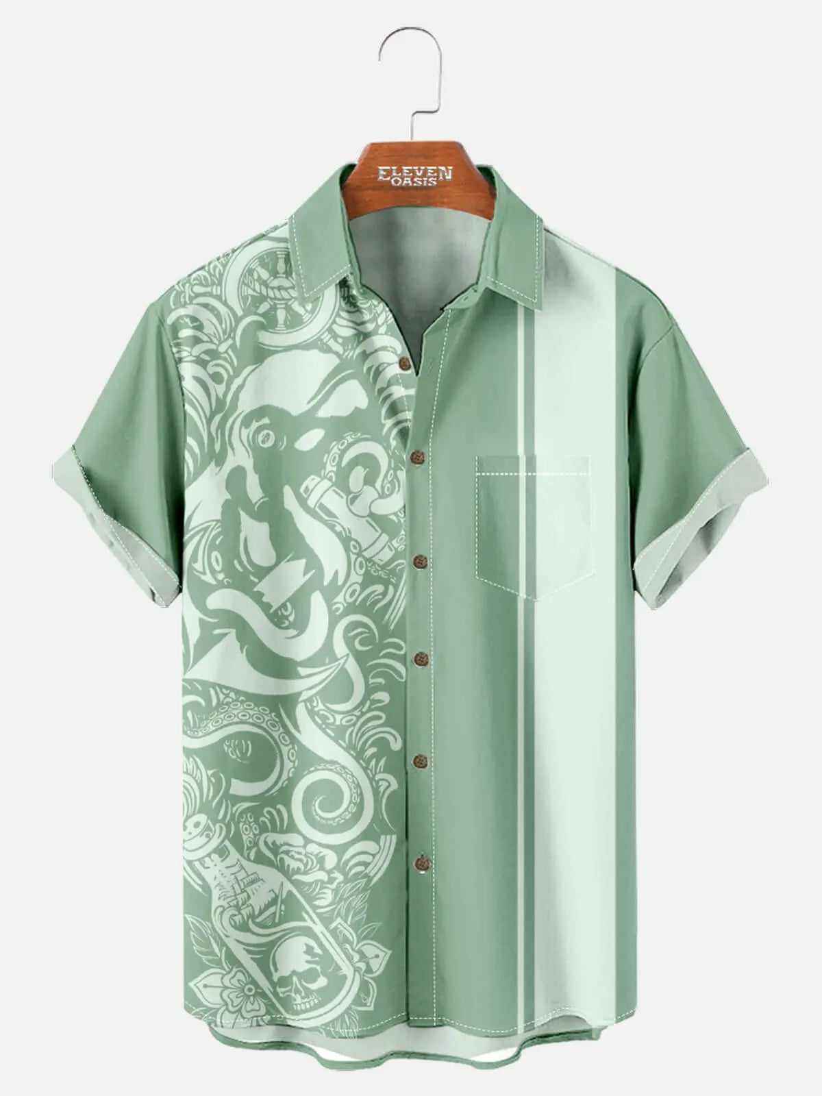 Drenched in deep tones and rich detail, this shirt features an all-over tattoo-style kraken design with shipwrecks, messages in bottles, and swirling tentacles. Paired with sleek shadow stripes, it’s a bold tribute to nautical lore and dark maritime legends — perfect for after-hours adventurers.