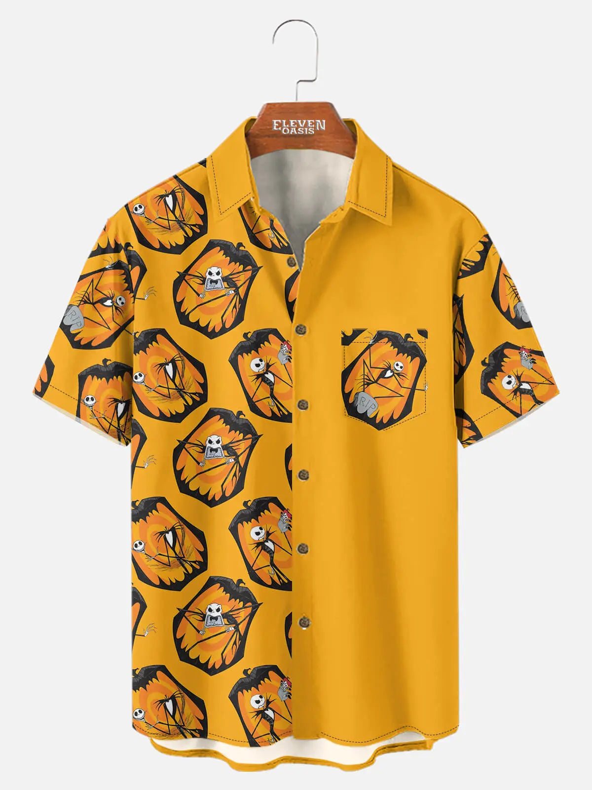 Step into Halloween Town with this bold yellow shirt featuring Jack Skellington inside glowing pumpkin lanterns. The all-over print adds a vibrant twist to spooky season style, making it a perfect pick for fans of The Nightmare Before Christmas. Fun, eye-catching, and full of Halloween spirit.