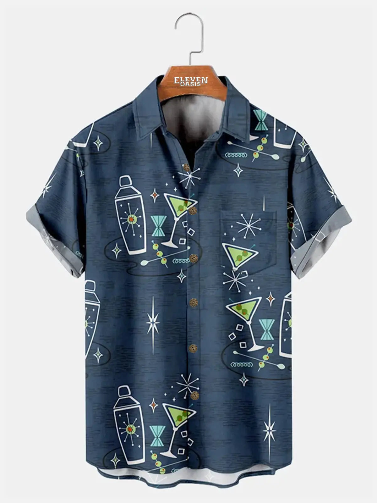 Shake up your style with our mid-century modern cocktail shirt featuring retro martini glasses and atomic starbursts against a sophisticated navy backdrop. This vintage-inspired design captures the essence of 1950s lounge culture with playful cocktail shakers and olive garnishes for nostalgic charm.