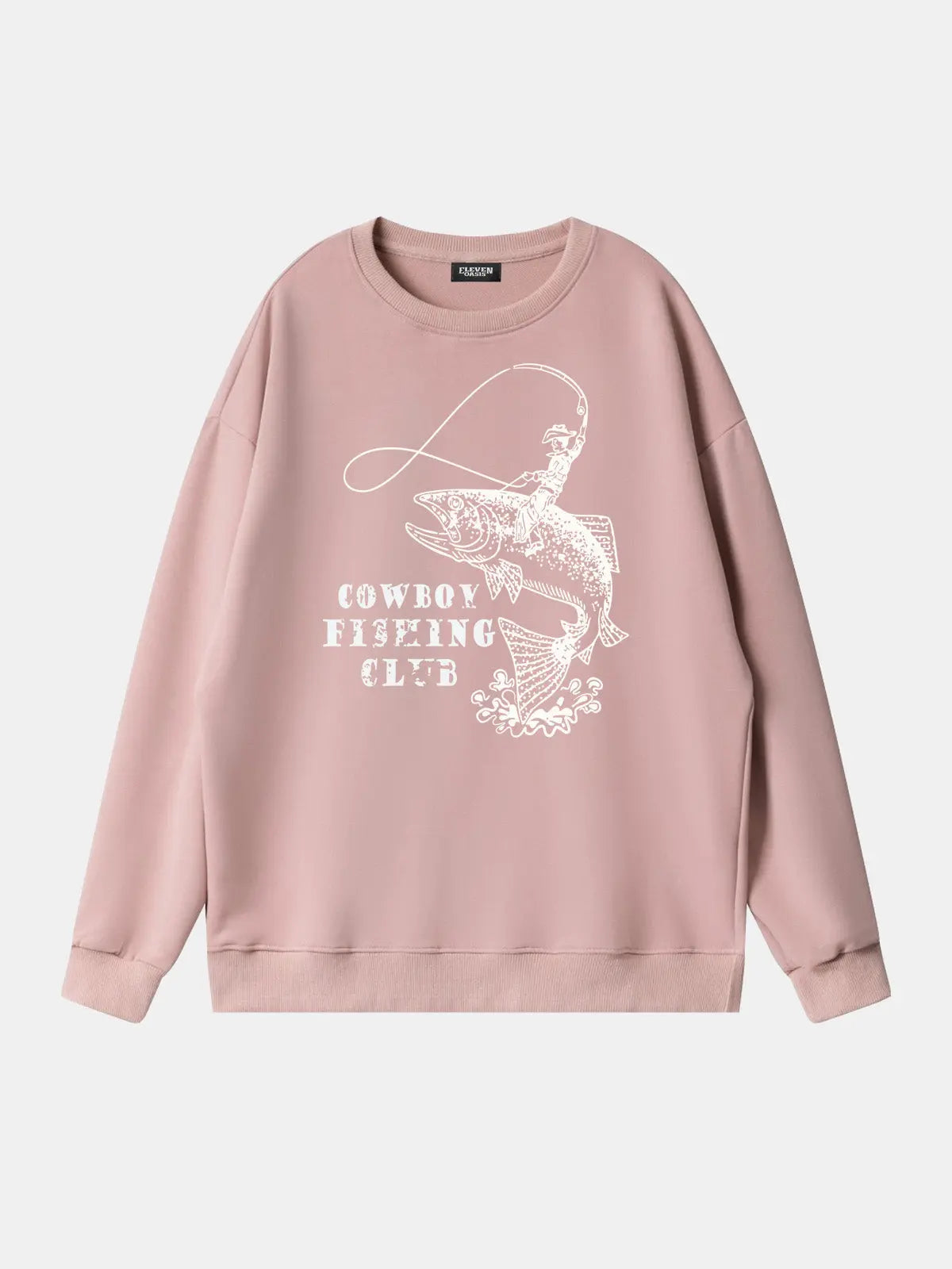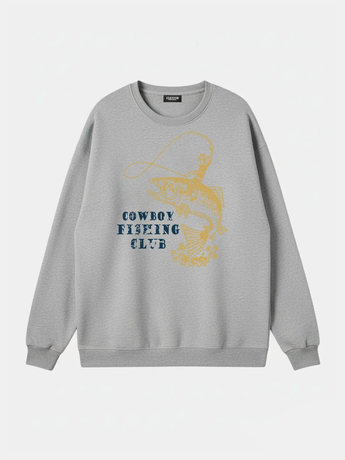 Classic pullover sweatshirt featuring a bold cowboy-and-fish design with "Cowboy Fishing Club” lettering. Rugged and playful, this piece blends Western spirit with outdoor adventure vibes, making it a versatile choice for cooler days.
