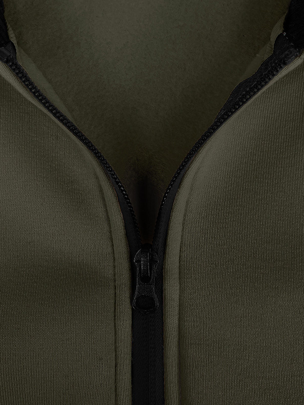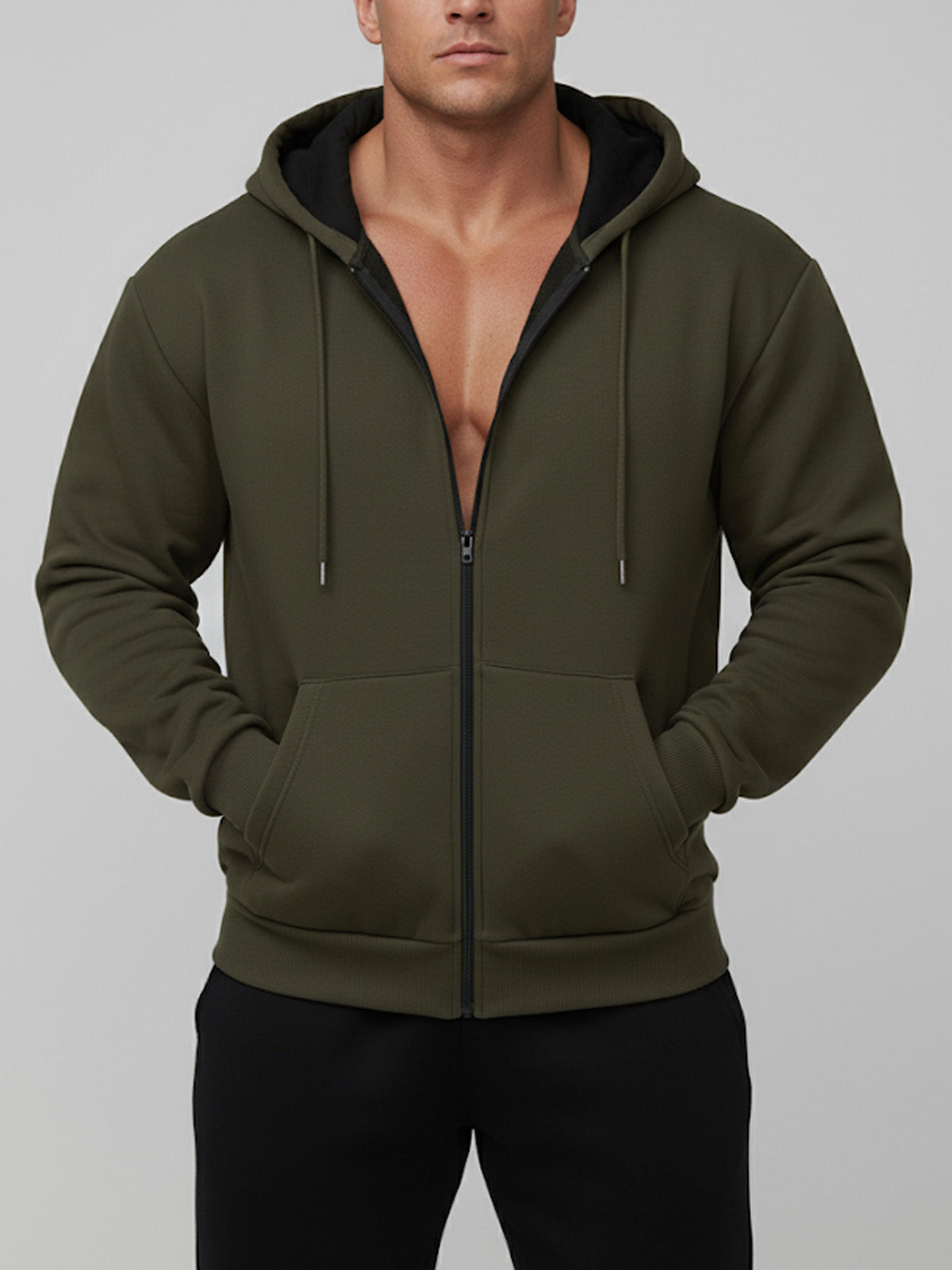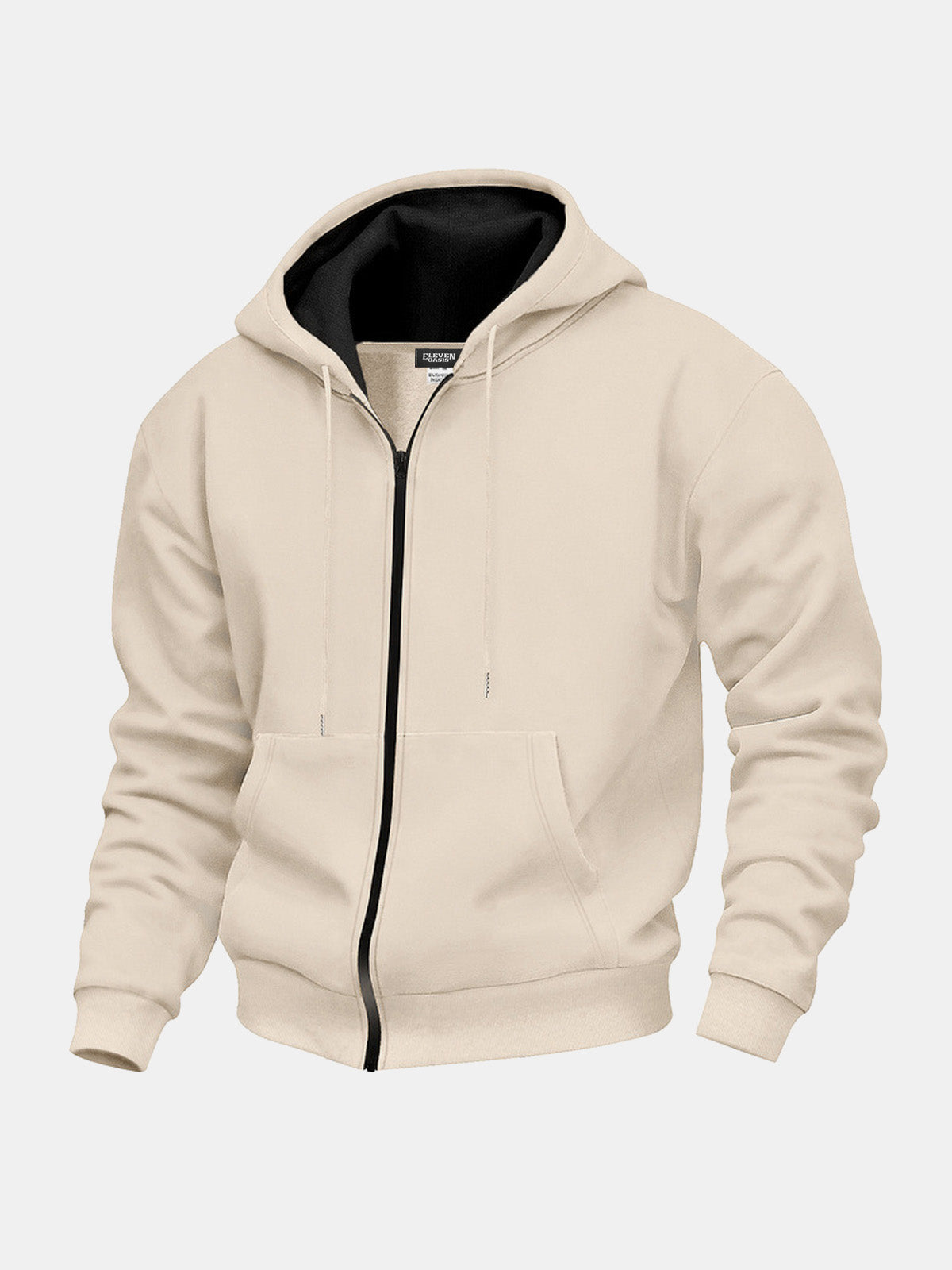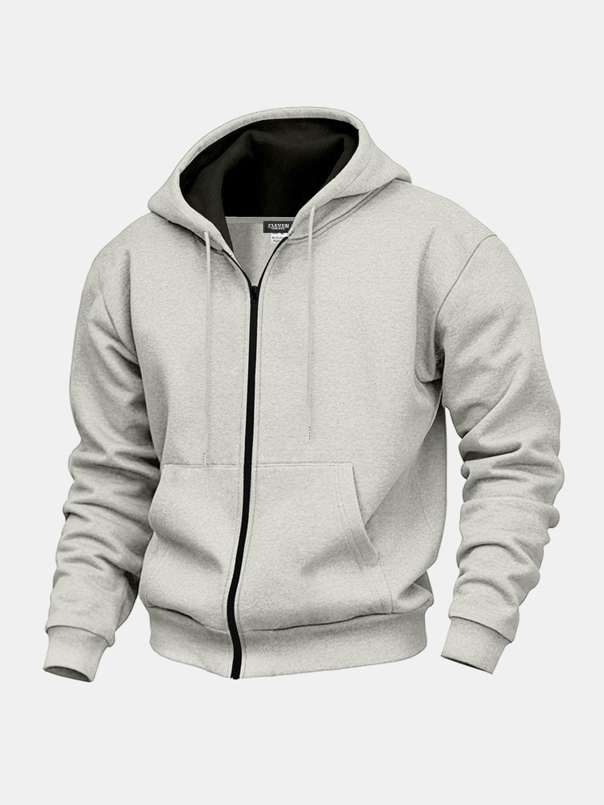 This versatile zip-up hoodie is designed for comfort and everyday wear, featuring a soft fleece interior and adjustable drawstring hood. With ribbed cuffs, hem, and spacious front pockets, it provides warmth and functionality, making it a reliable go-to for layering in cooler seasons.