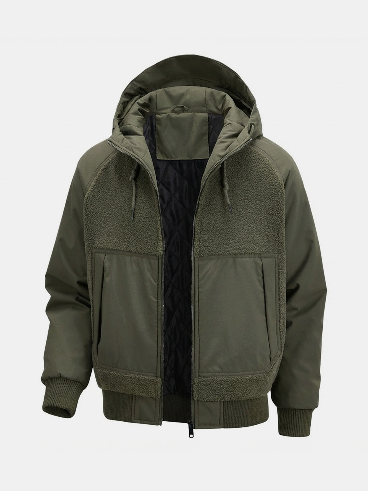This hooded puffer blends smooth insulated fabric with textured sherpa-style panels for added warmth and visual depth. Designed with a structured hem, ribbed cuffs, and a protective hood, it delivers a comfortable cold-weather layer that works for winter commutes, outdoor errands, and relaxed weekend wear.