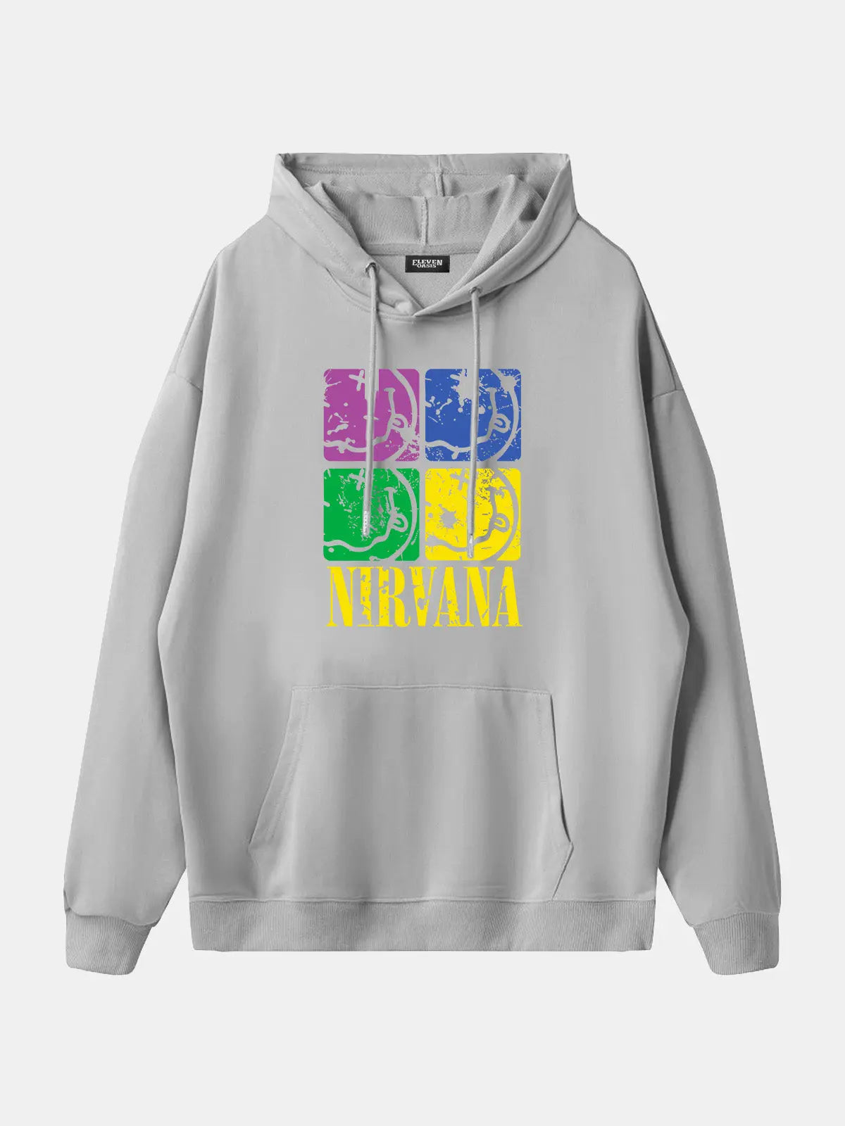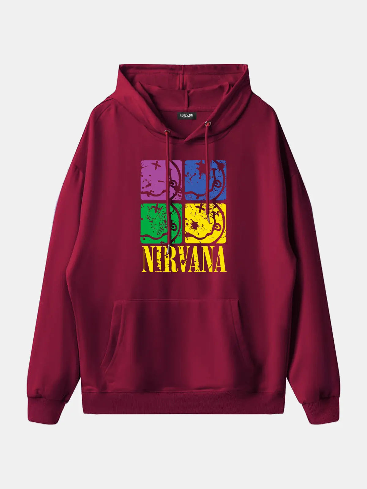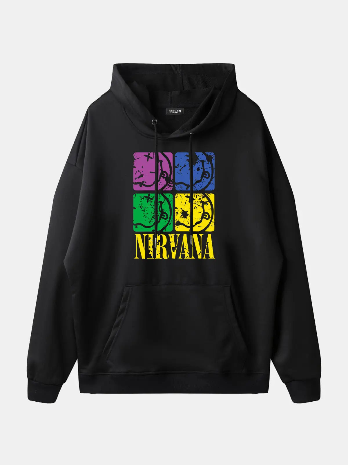 Bold band hoodie featuring Nirvana’s name paired with a four-panel pop-art design of their iconic smiley face logo. The colorful block print adds a fresh twist to the band’s grunge legacy, making this piece stand out as both retro and modern.