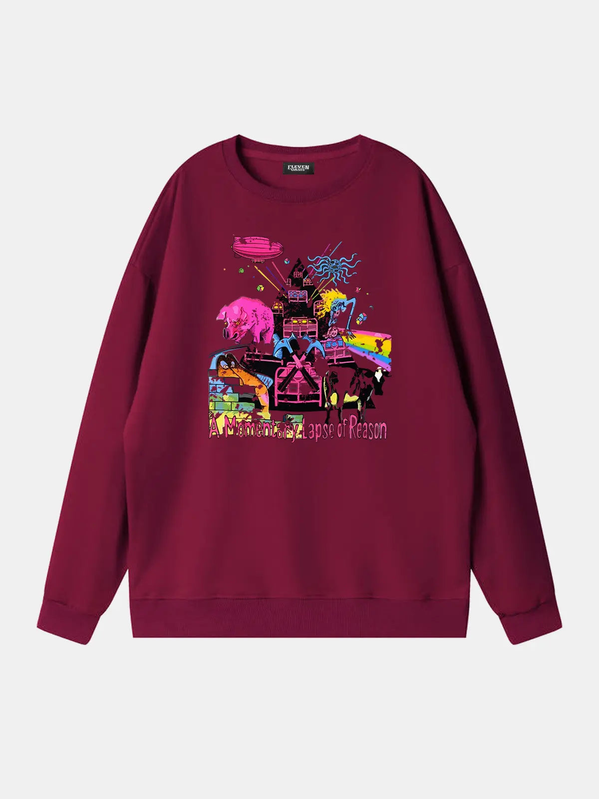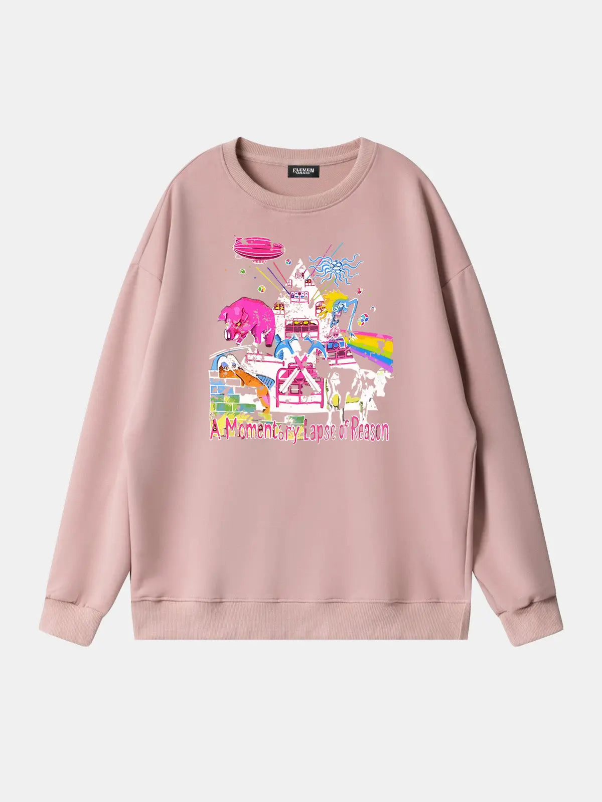 Classic band sweatshirt showcasing Pink Floyd's "A Momentary Lapse of Reason”–themed collage in vivid psychedelic colors. A must-have layering piece for fans of progressive rock and vintage-inspired style.