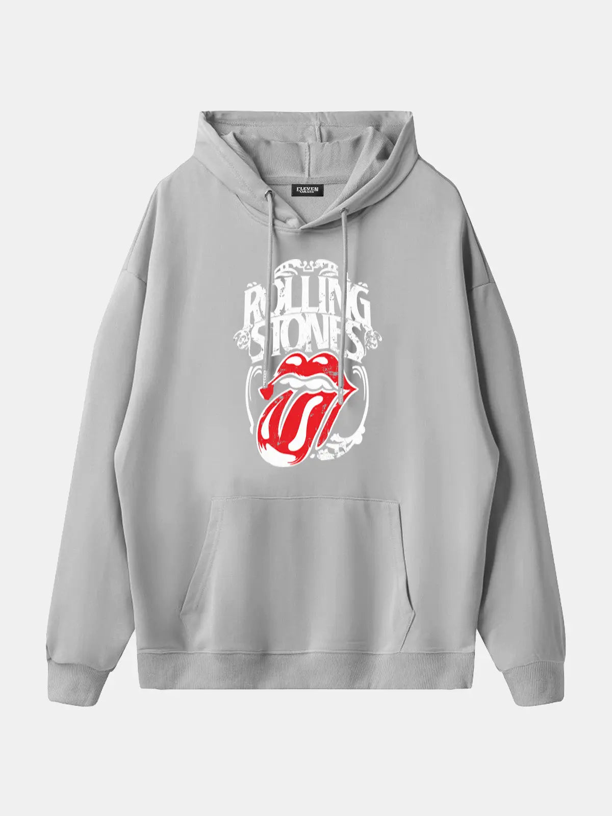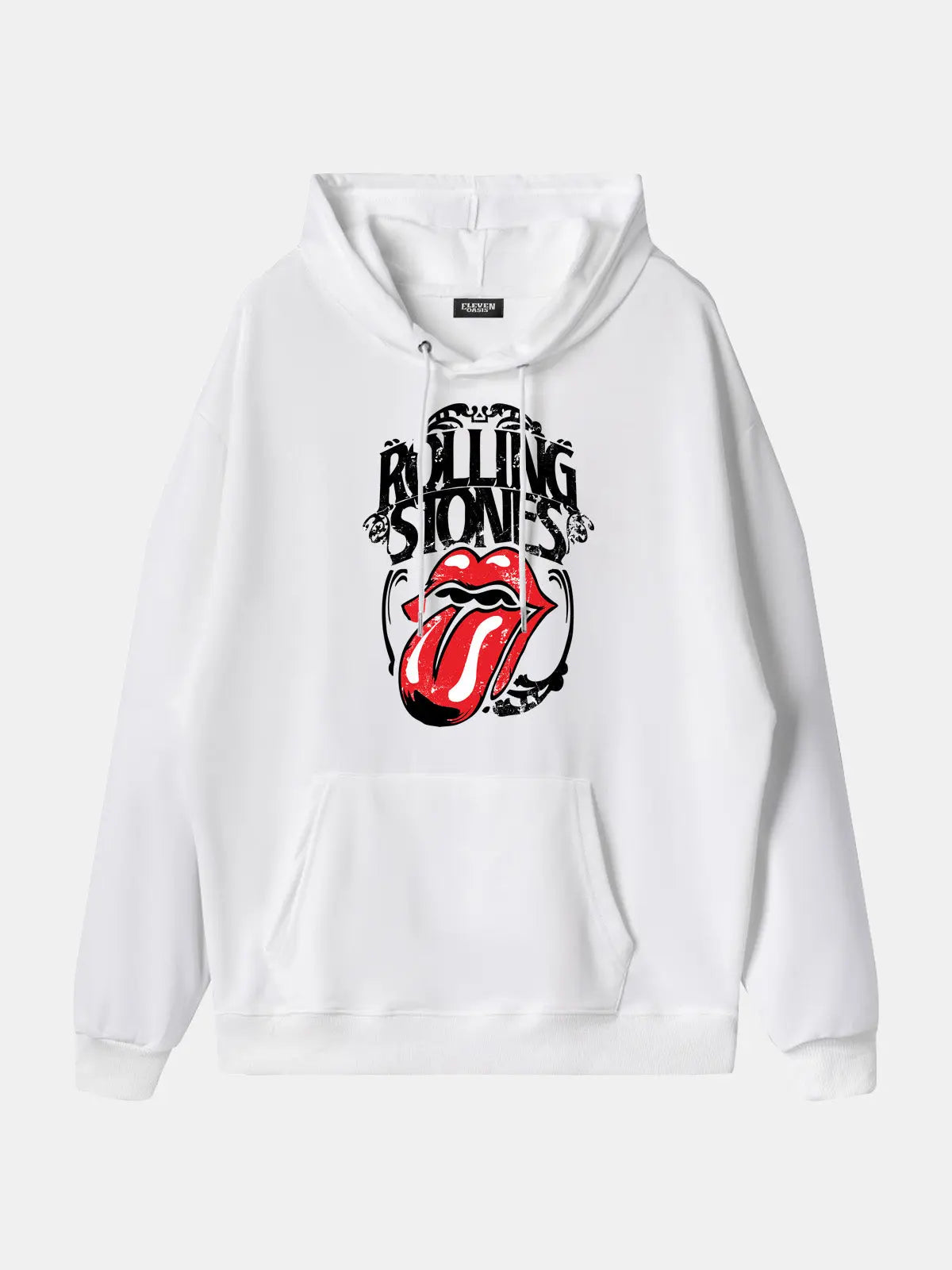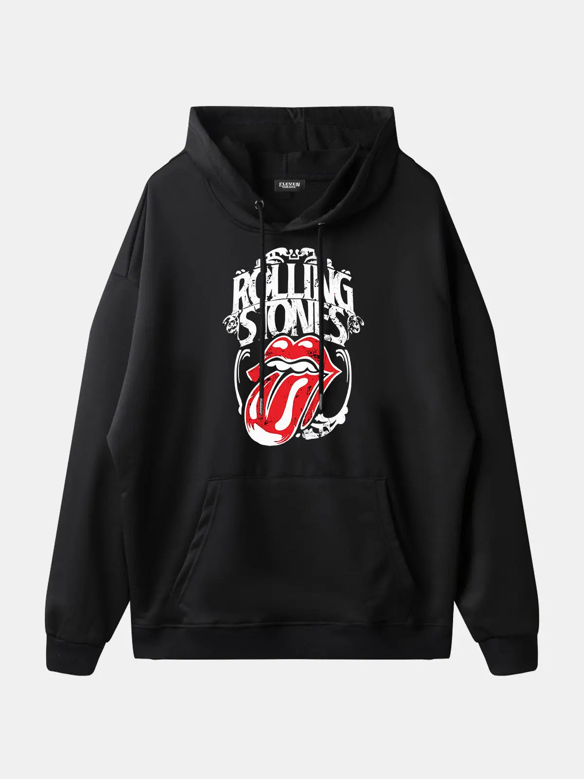 Classic band hoodie featuring the Rolling Stones’ iconic lips-and-tongue emblem beneath ornate scroll-style lettering. The distressed rock design captures the band’s rebellious energy, making it a must-have piece for fans and collectors of timeless rock history.
