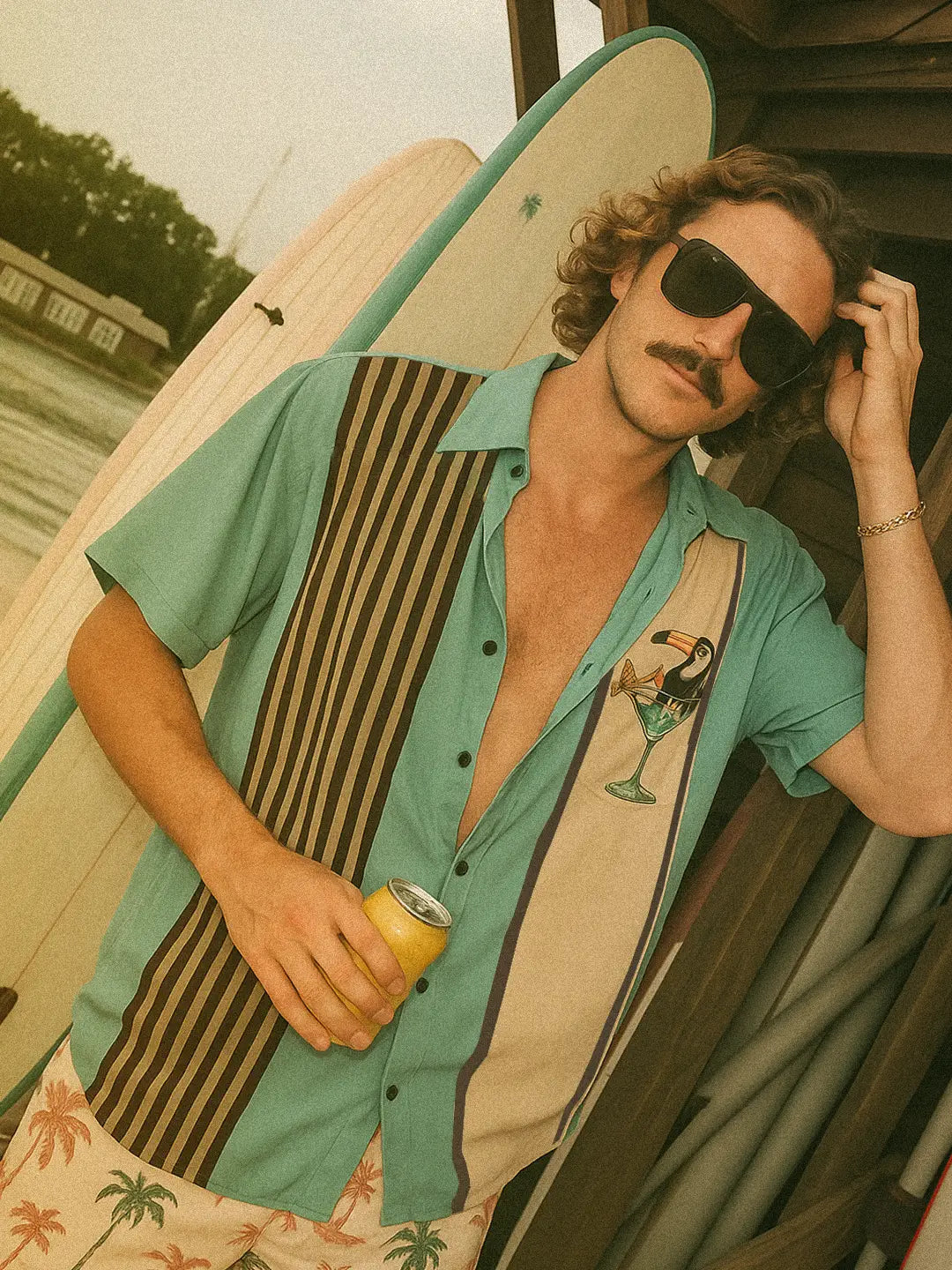 Men's Striped Everyday with Toucan in a Cocktail Glass Short Sleeve Casual Shirt