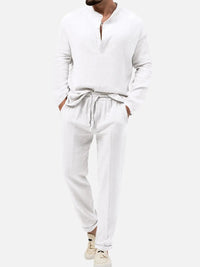 Refined loungewear featuring stand-up band collar and elastic drawstring waist for comfortable fit. This two-piece set combines modern styling with textured lightweight polyester that mimics premium linen. Available in multiple versatile colorways including light blue, white, black, gray, beige, and brown for everyday casual elegance.