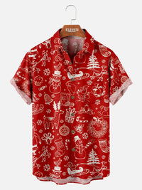 Bring the holiday spirit to life with this playful short sleeve shirt, featuring white doodle-style Christmas icons on a bold red background. Perfect for adding a fun, festive touch to any seasonal gathering.